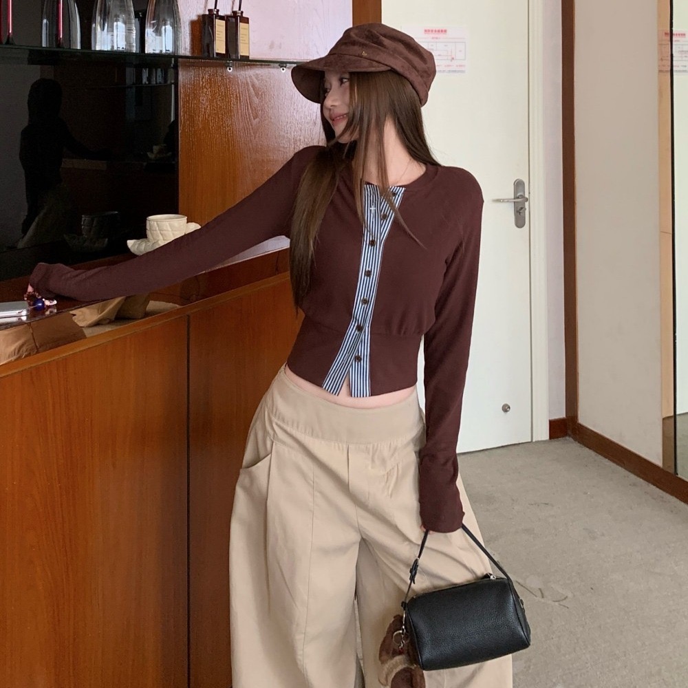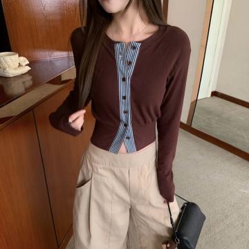 撞色条纹拼接设计感长袖开衫圆领内搭T恤短款上衣
