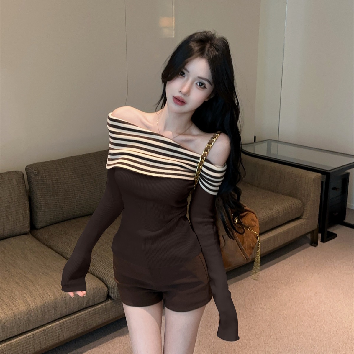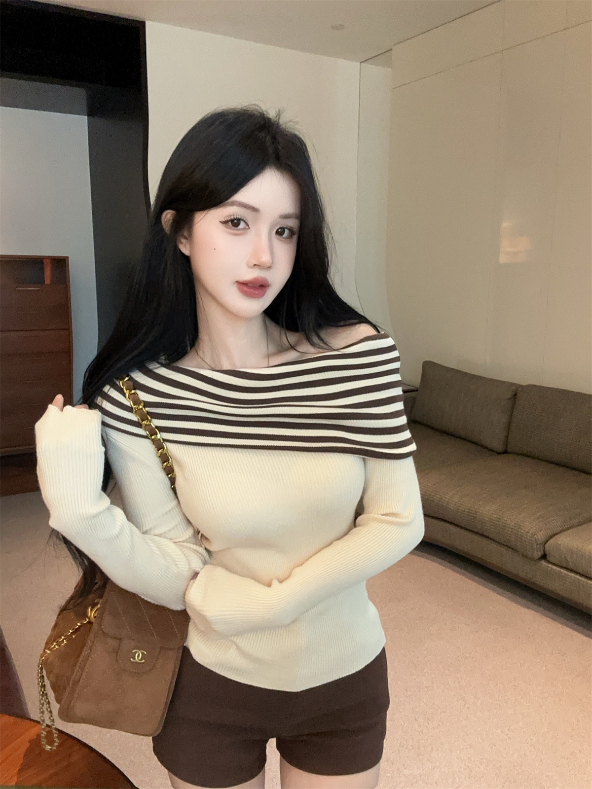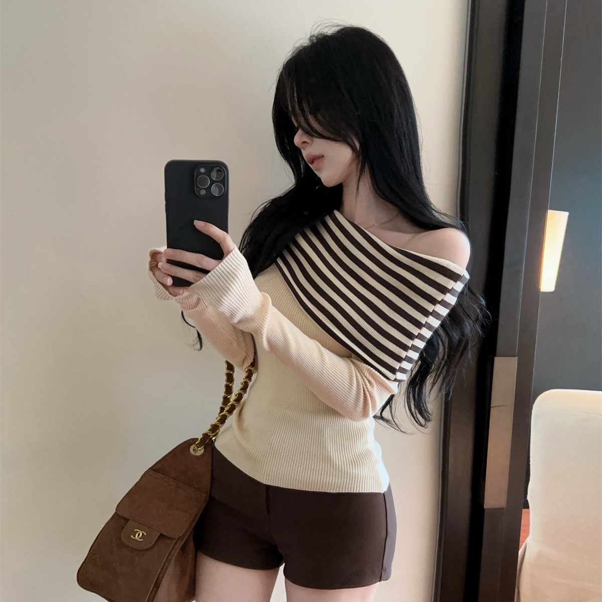 FA52540# 针织衫女新款秋季修身显瘦斜肩上衣露肩内搭打底衫女 服裝批發女裝批發服飾貨源