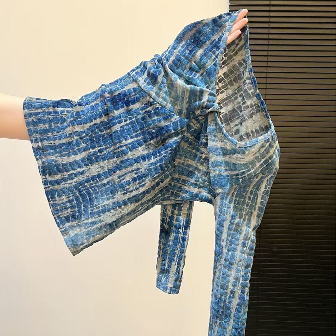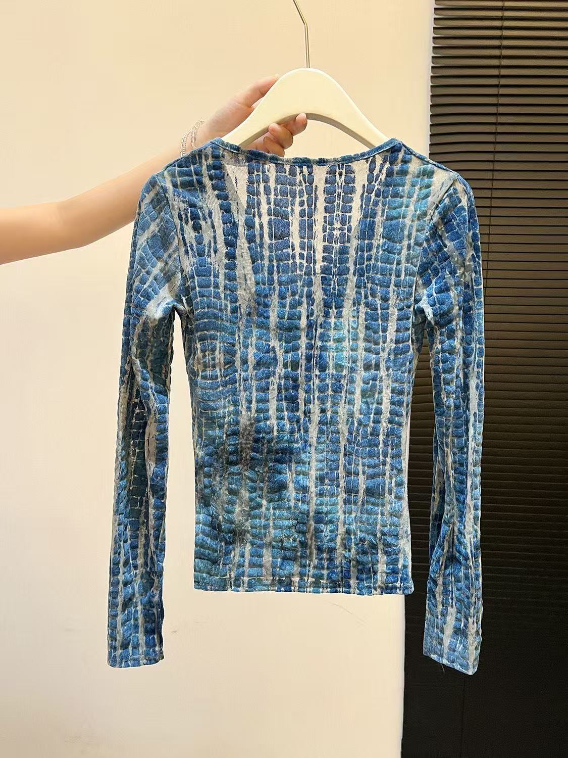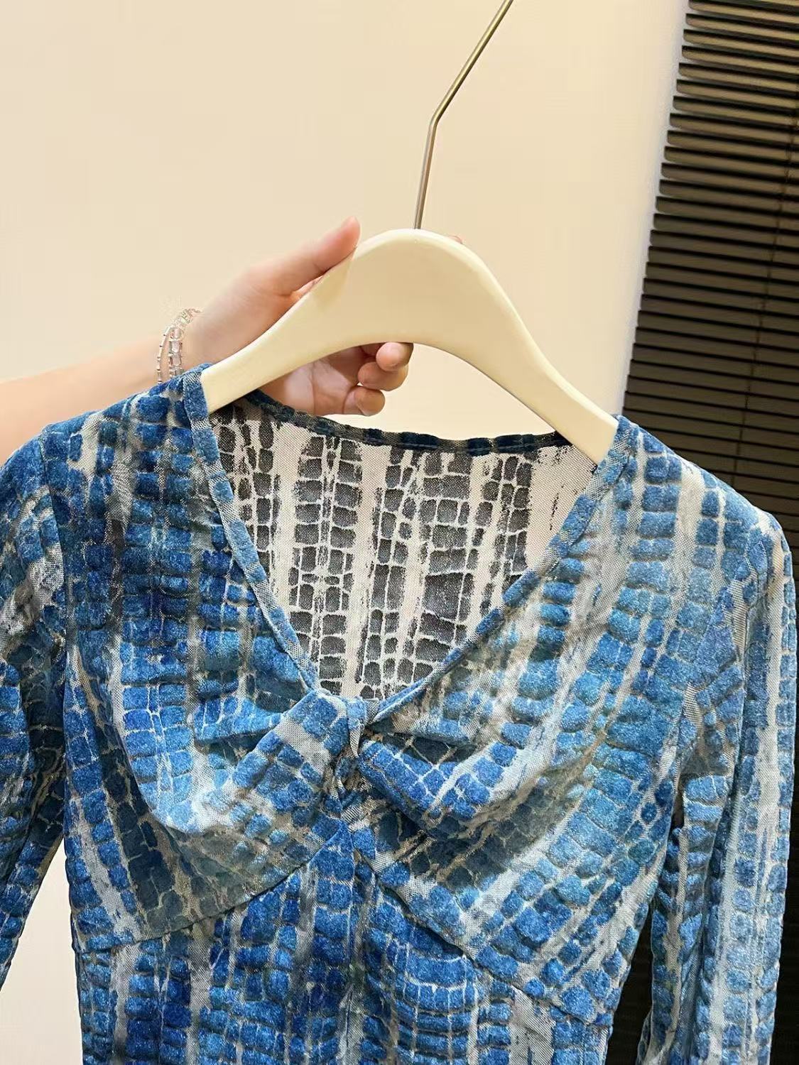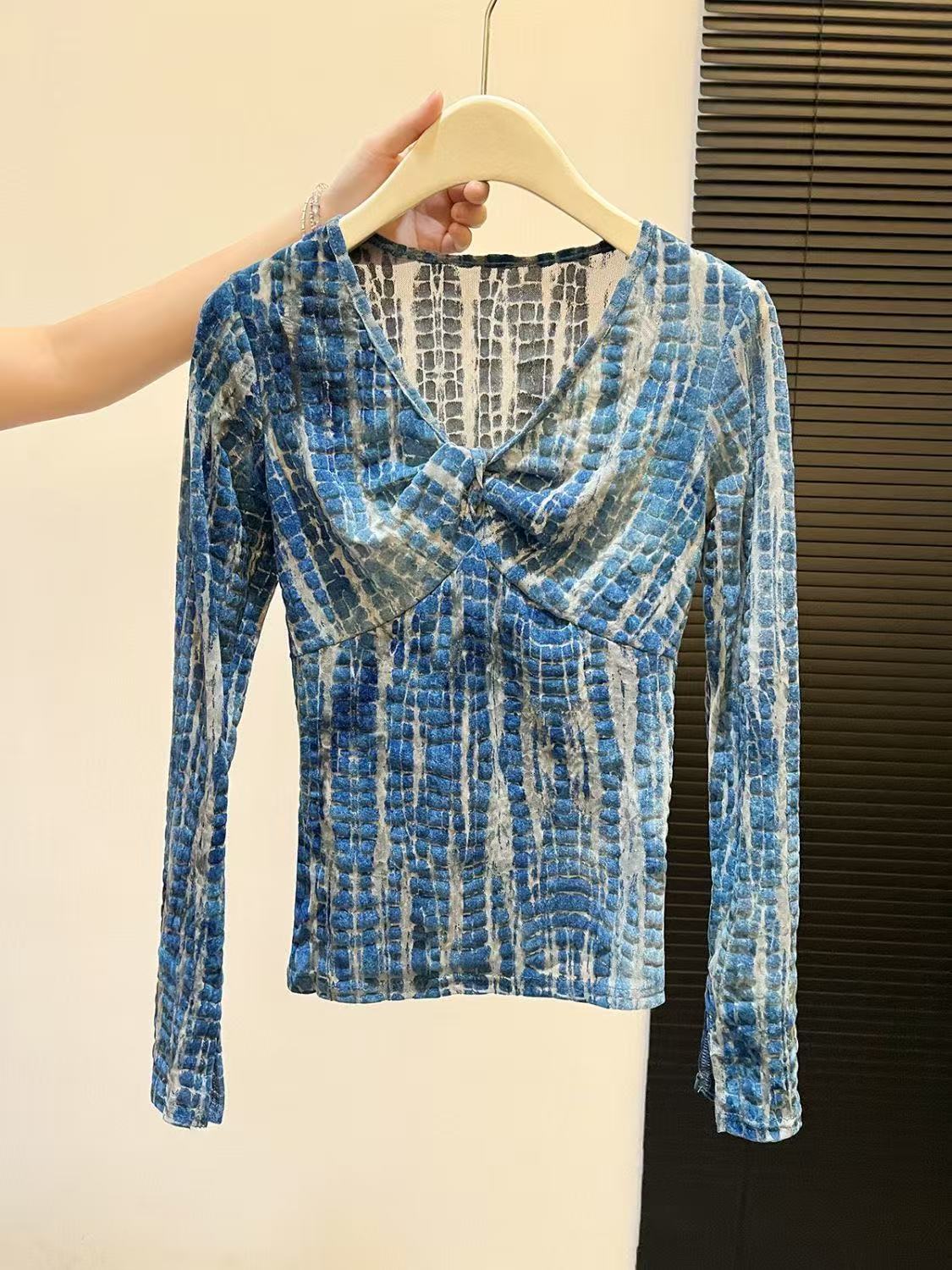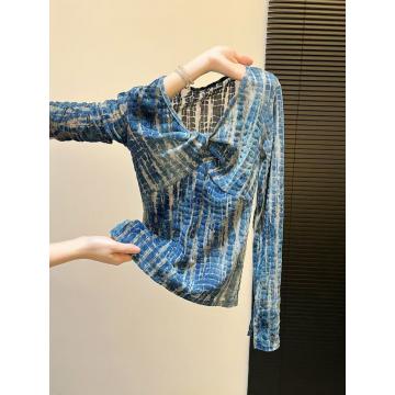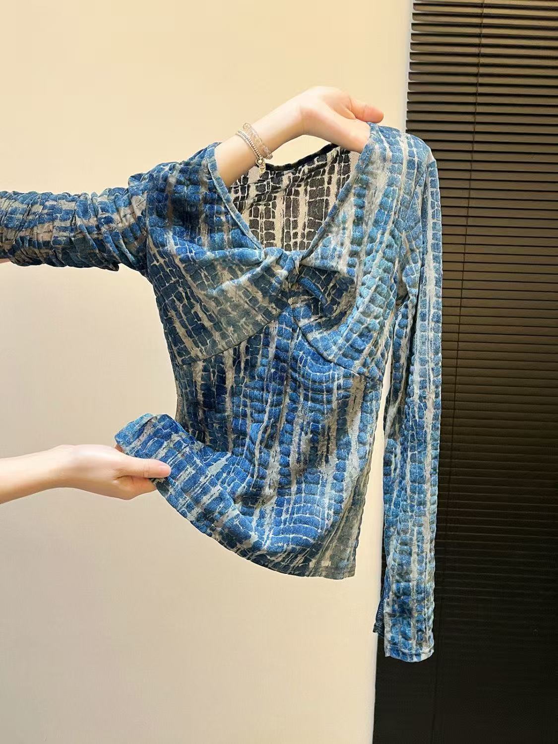 FA52547# 新款T恤法式高级感V领褶皱扎染薄款设计修身显瘦长袖上衣女 服裝批發女裝批發服飾貨源