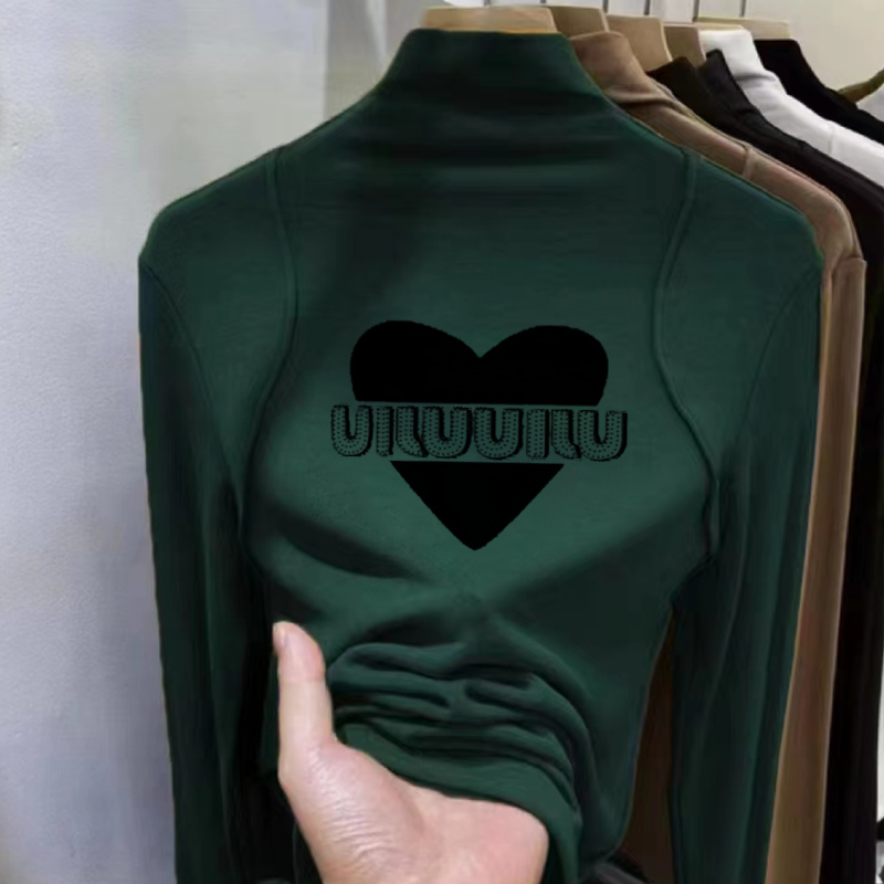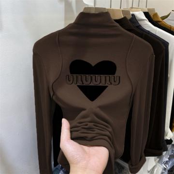 FA52563# 德绒面料纯欲咖色半高领打底衫内搭秋冬新款爱心长袖t恤上衣 服裝批發女裝批發服飾貨源