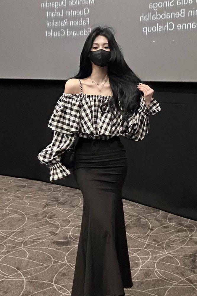 FA52773# 早秋套装新款洋气小香风格子一字肩上衣+百搭鱼尾裙子两件套 服裝批發女裝批發服飾貨源