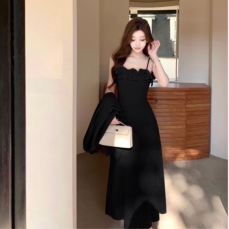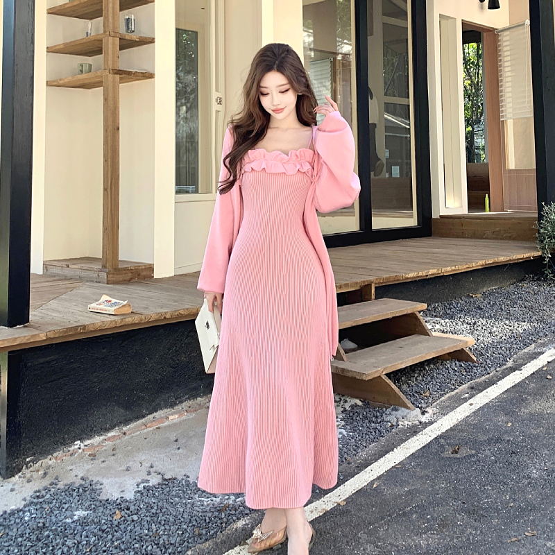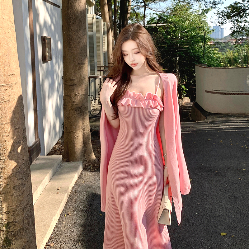 FA52799# 氛围感花朵针织吊带连衣裙秋冬新款气质中长款毛衣外套两件套 服裝批發女裝批發服飾貨源
