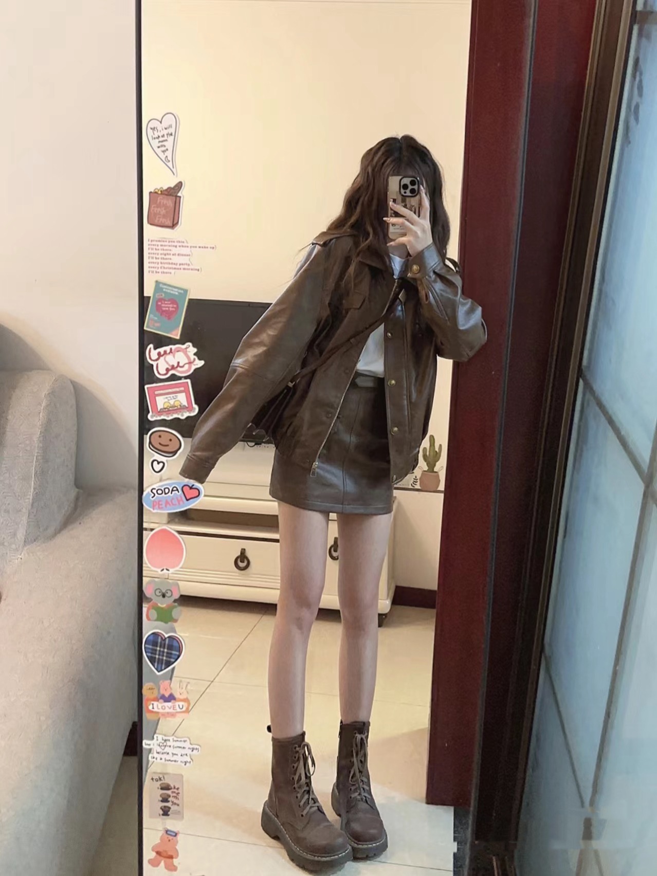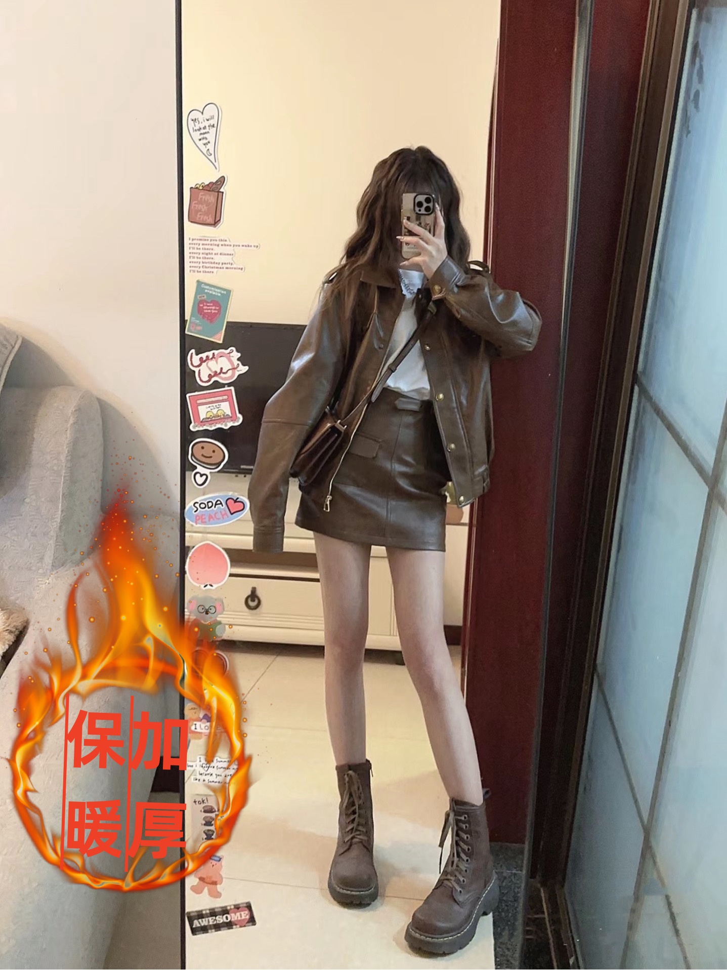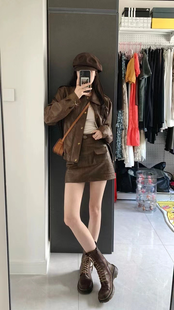 FA52835# 美式咖色机车服pu皮衣外套包臀半身裙套装 服裝批發女裝批發服飾貨源