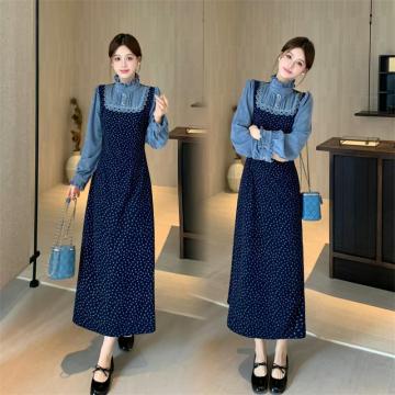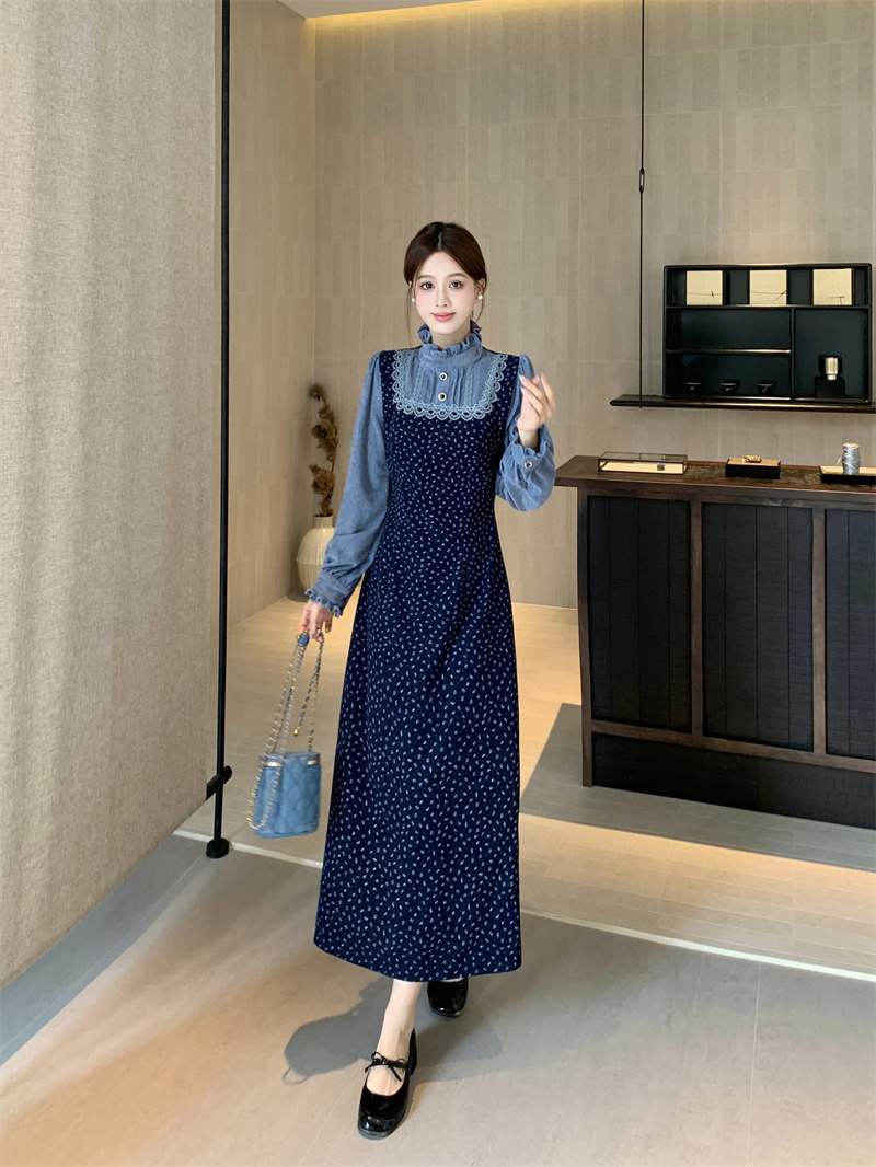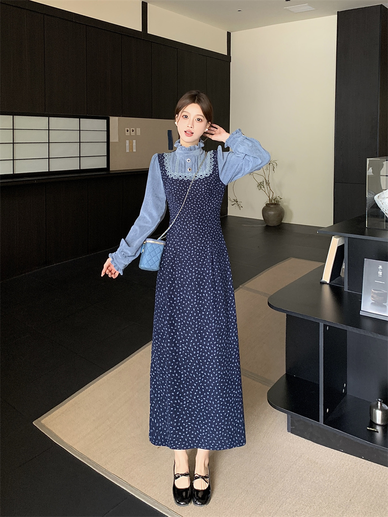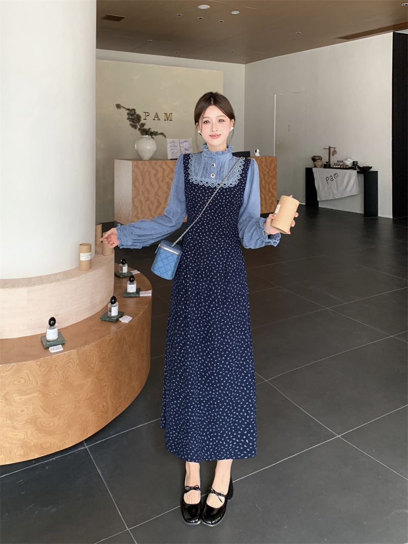 FA52963# 大码海兰花秋冬法式设计感碎花假两件拼接长袖连衣裙 服裝批發女裝批發服飾貨源