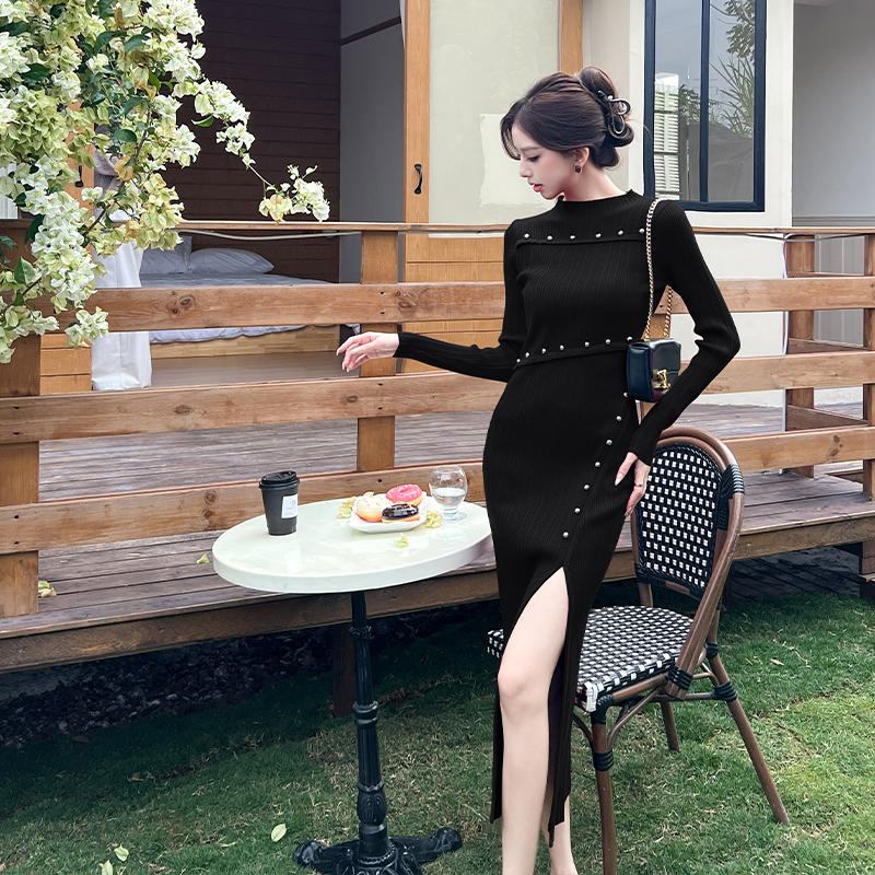 FA53137# 秋冬新款时尚气质针织连衣裙女毛衣裙设计感开叉显瘦长裙 服裝批發女裝批發服飾貨源