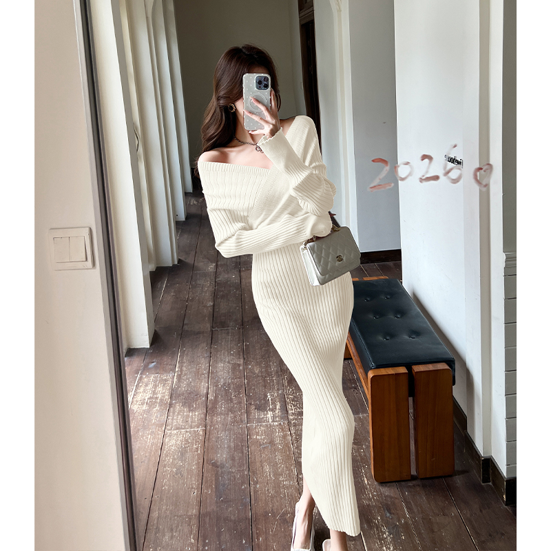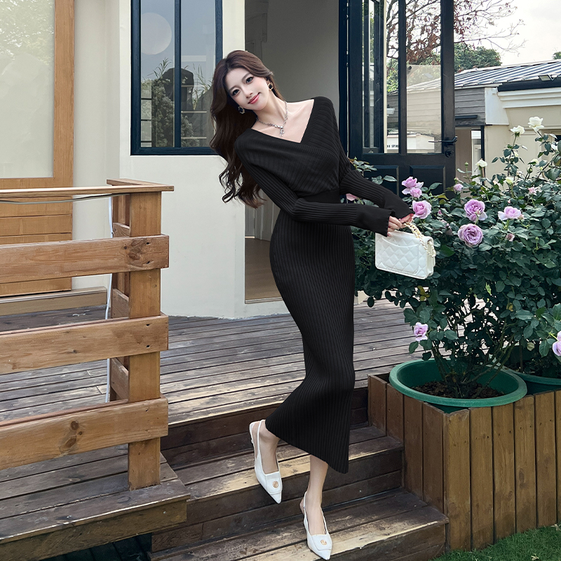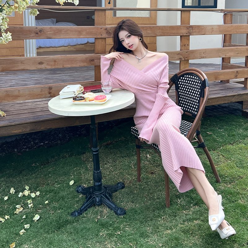 FA53141# 纯欲修身法式气质御姐收腰包臀粉色针织连衣裙V领内搭打底长裙 服裝批發女裝批發服飾貨源