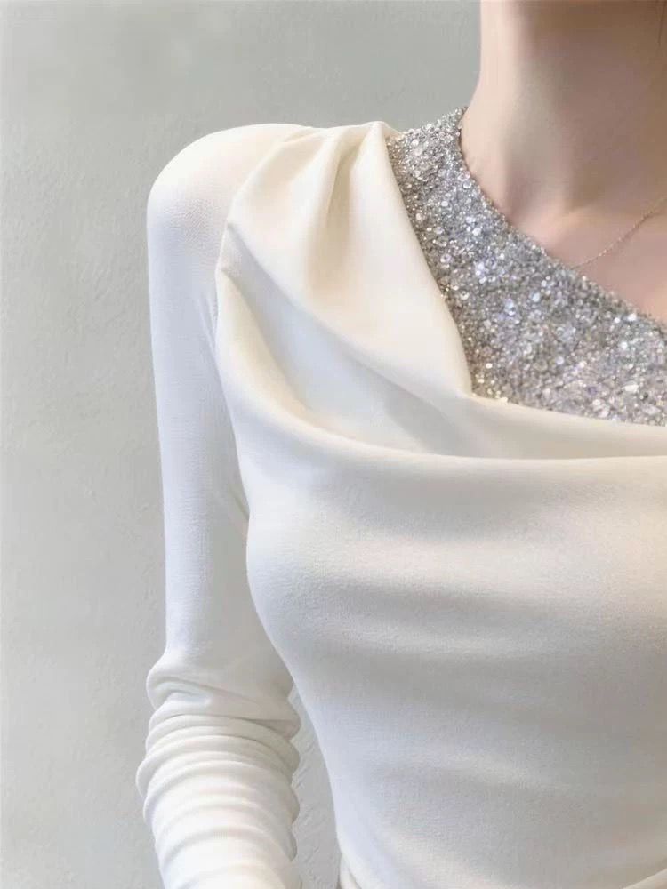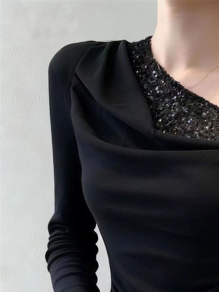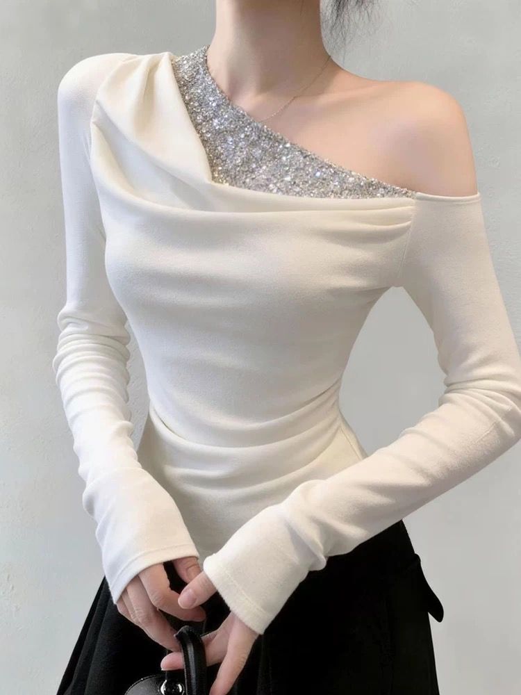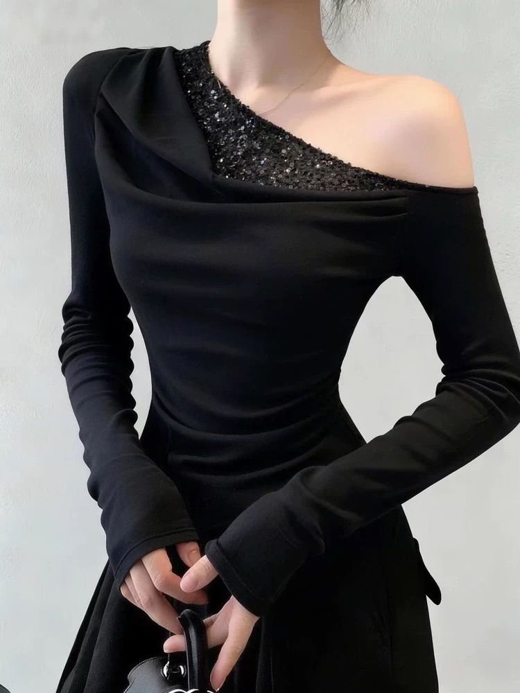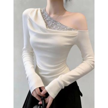 FA53221# 秋冬拼接斜领露肩修身显瘦打底衫女内搭设计感长袖t恤上衣 服裝批發女裝批發服飾貨源