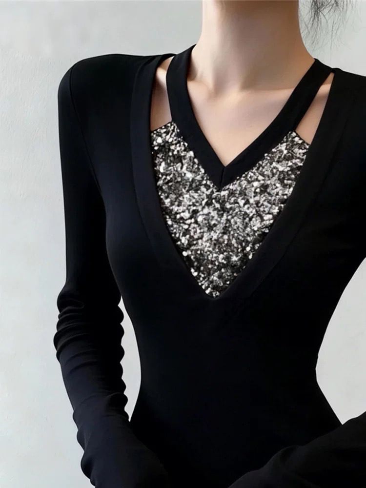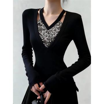 Home > 长袖T恤 > FA53223# v领法式烫钻收腰显瘦绝美上衣磨毛加绒打底衫女内搭秋冬 服裝批發女裝批發服飾貨源