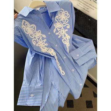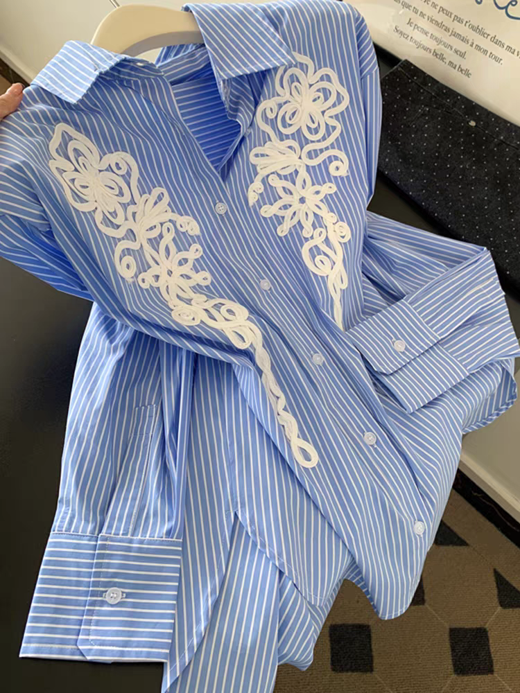 FA53226# 蓝色条纹polo领设计感长袖衬衫女上衣小个子新款超火减龄衬衣 服裝批發女裝批發服飾貨源