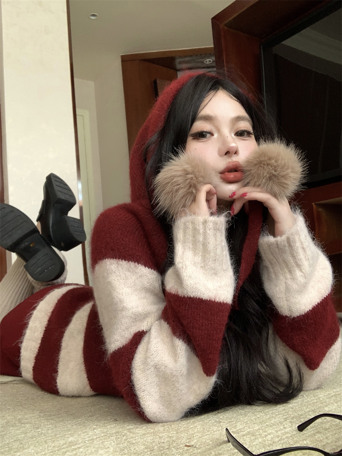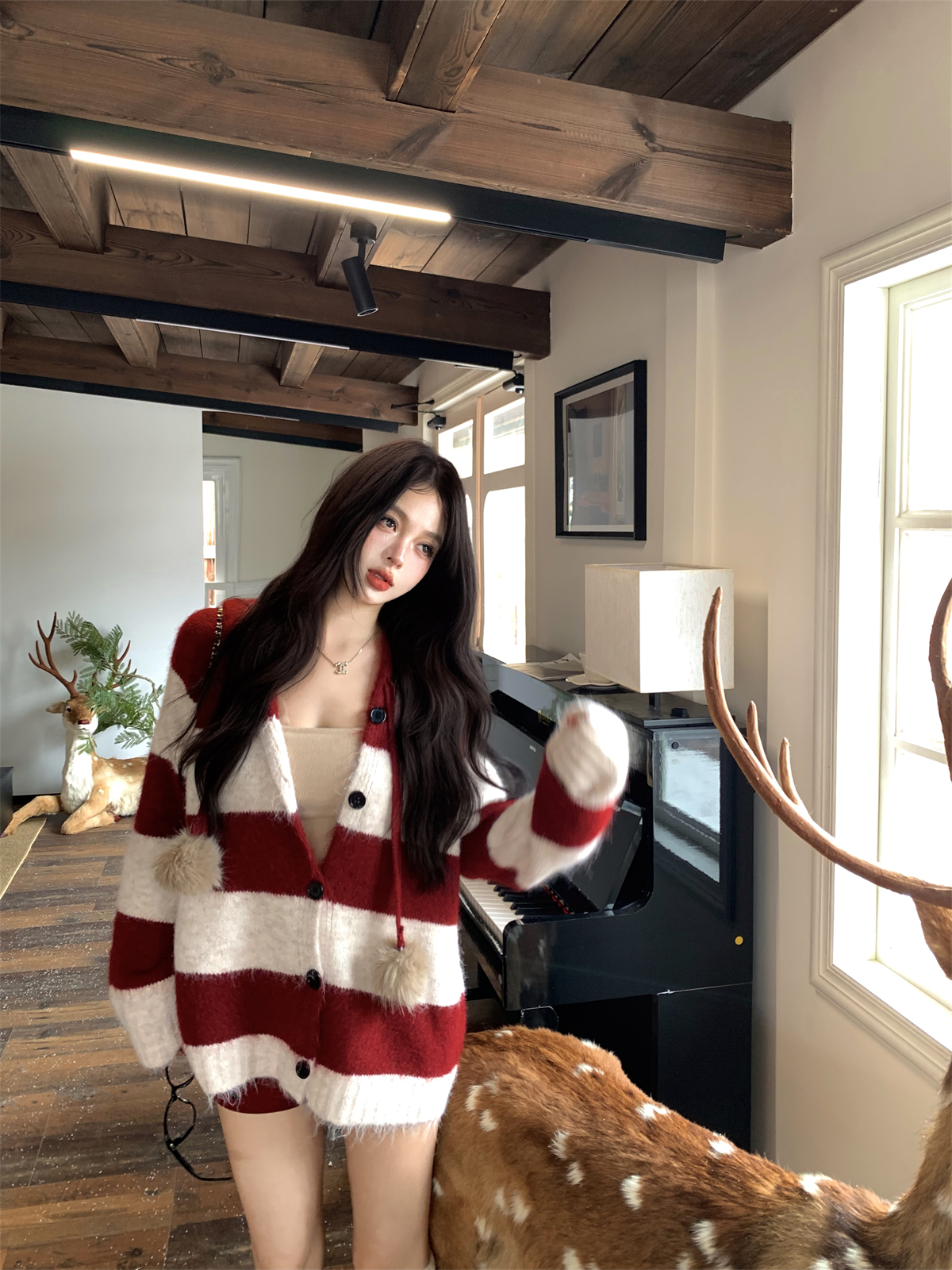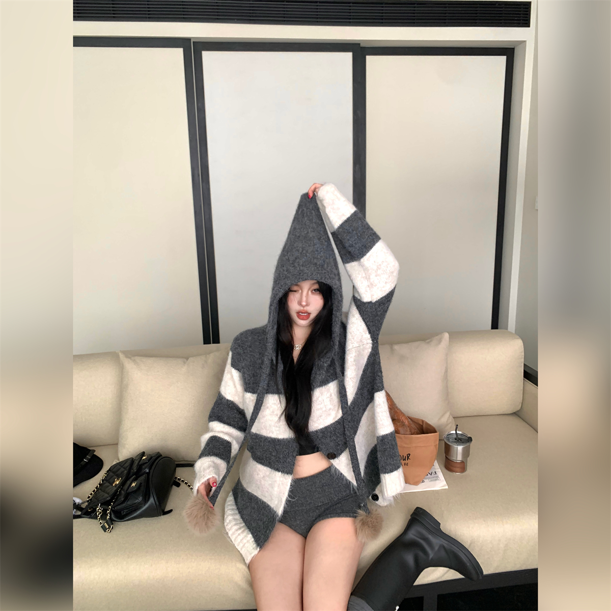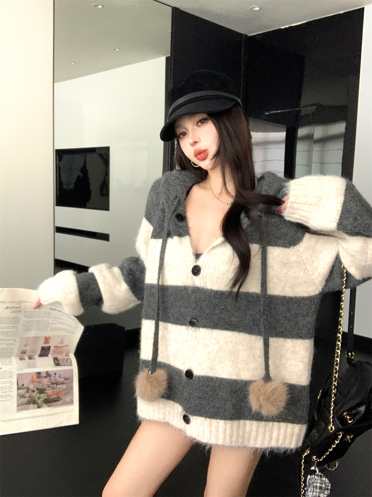 FA53237# 高品质秋新款宽松慵懒开衫条纹连帽长袖毛衣外套女 服裝批發女裝批發服飾貨源