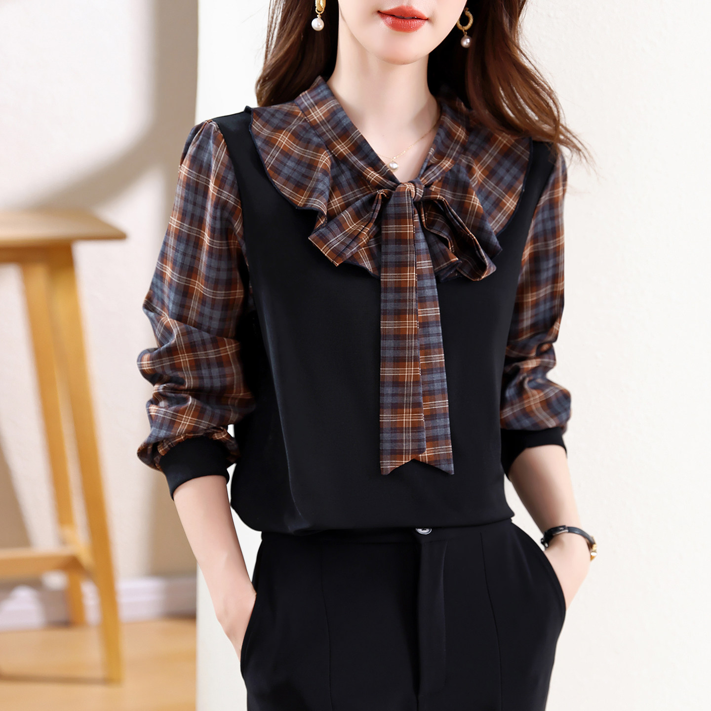 FA53261# 蝴蝶结格子长袖衬衫女士春秋季早秋减龄假两件衬衣女上衣 服裝批發女裝批發服飾貨源
