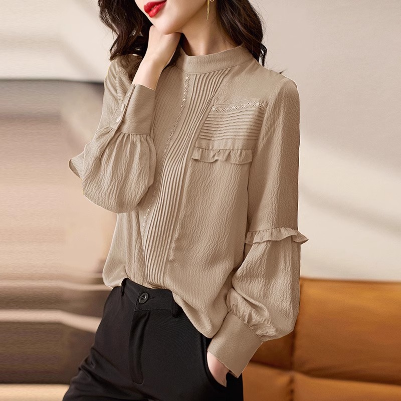 FA53263# 早春新款复古立领灯笼袖木耳边蕾丝刺绣真丝桑蚕丝衬衫上衣女 服裝批發女裝批發服飾貨源