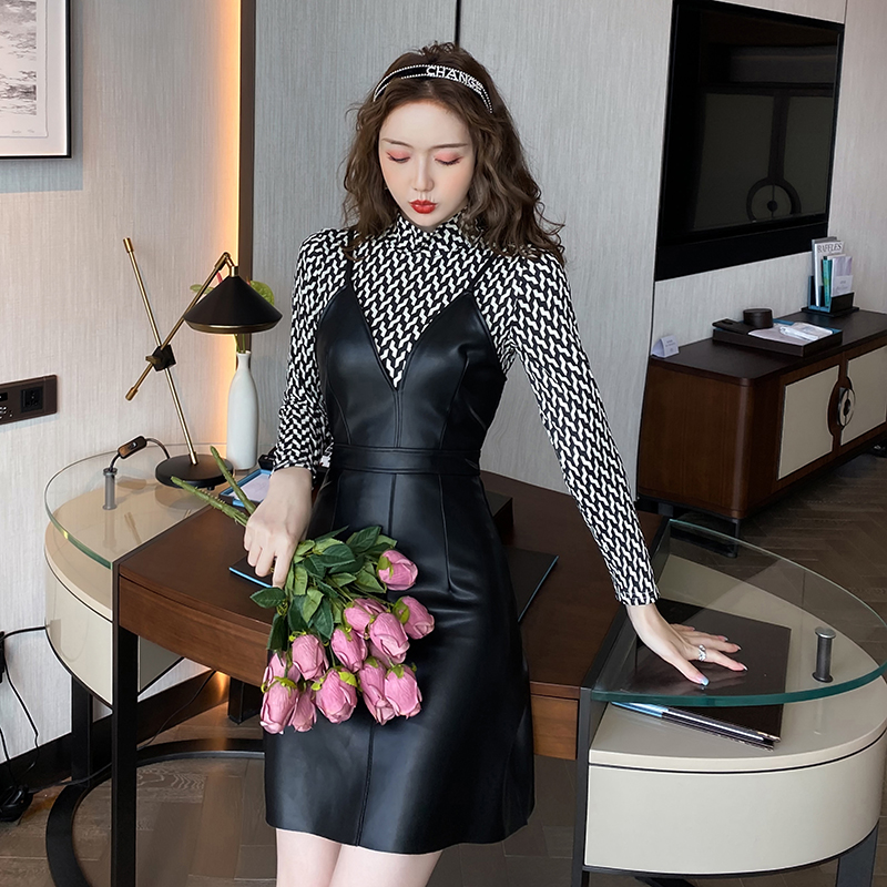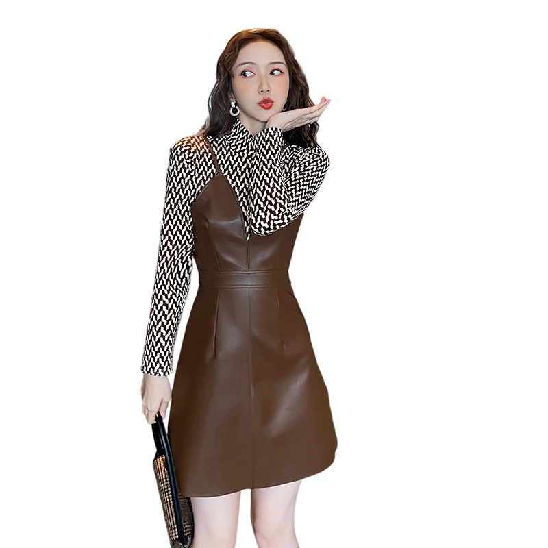 FA53271# 外贸秋冬新款气质减龄小个子时髦PU皮连衣裙套装两件套 服裝批發女裝批發服飾貨源
