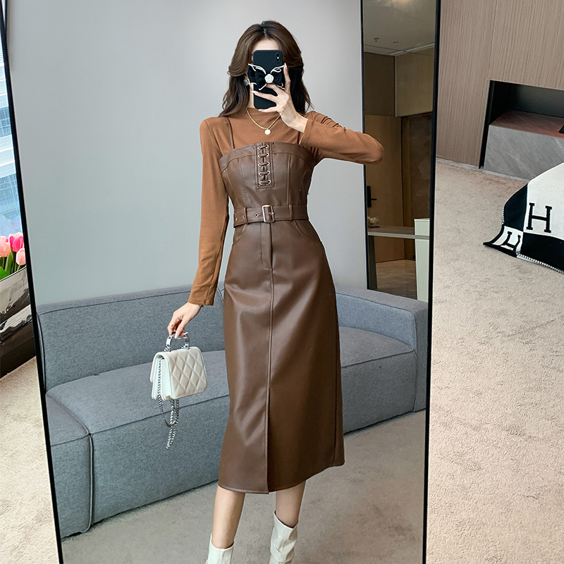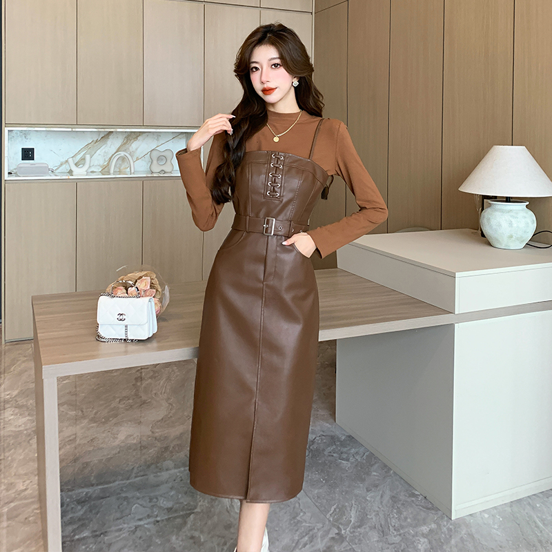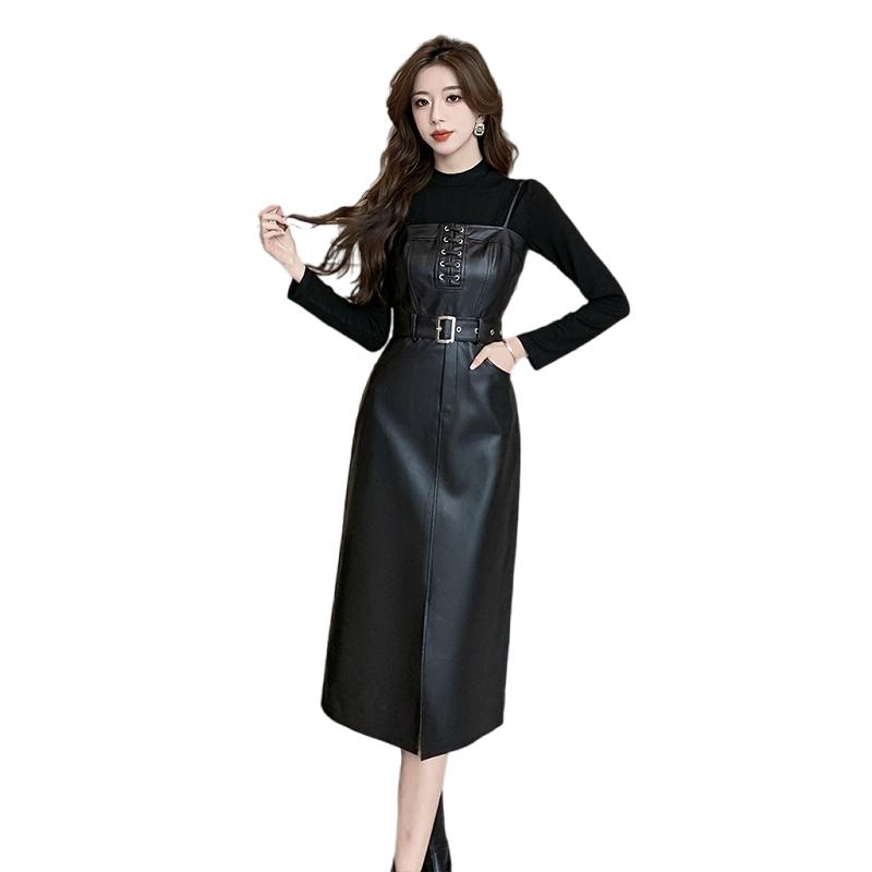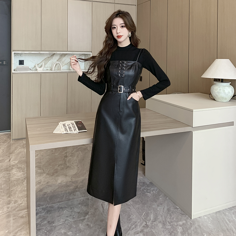 FA53276# 外贸秋冬显瘦法式高级感气质pu中长款裙子包臀吊带皮裙两件套 服裝批發女裝批發服飾貨源