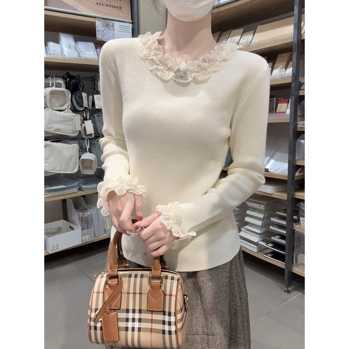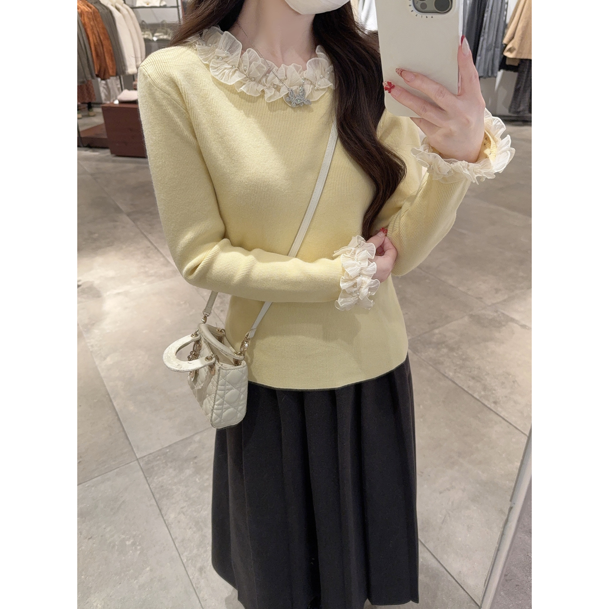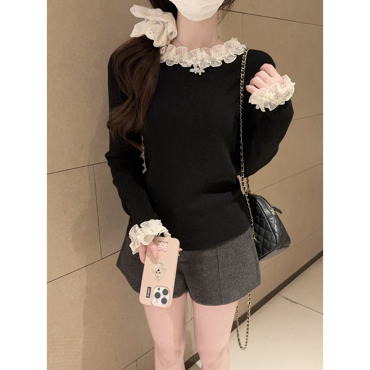 FA53430# 秋冬韩版温柔网纱拼接花边设计安迪绒针织衫打底毛衣 服裝批發女裝批發服飾貨源