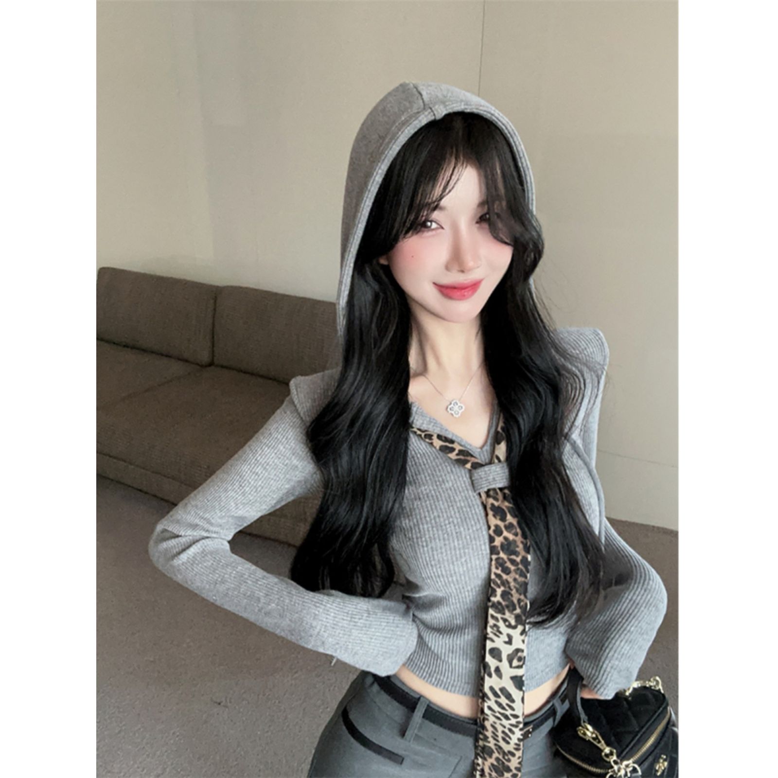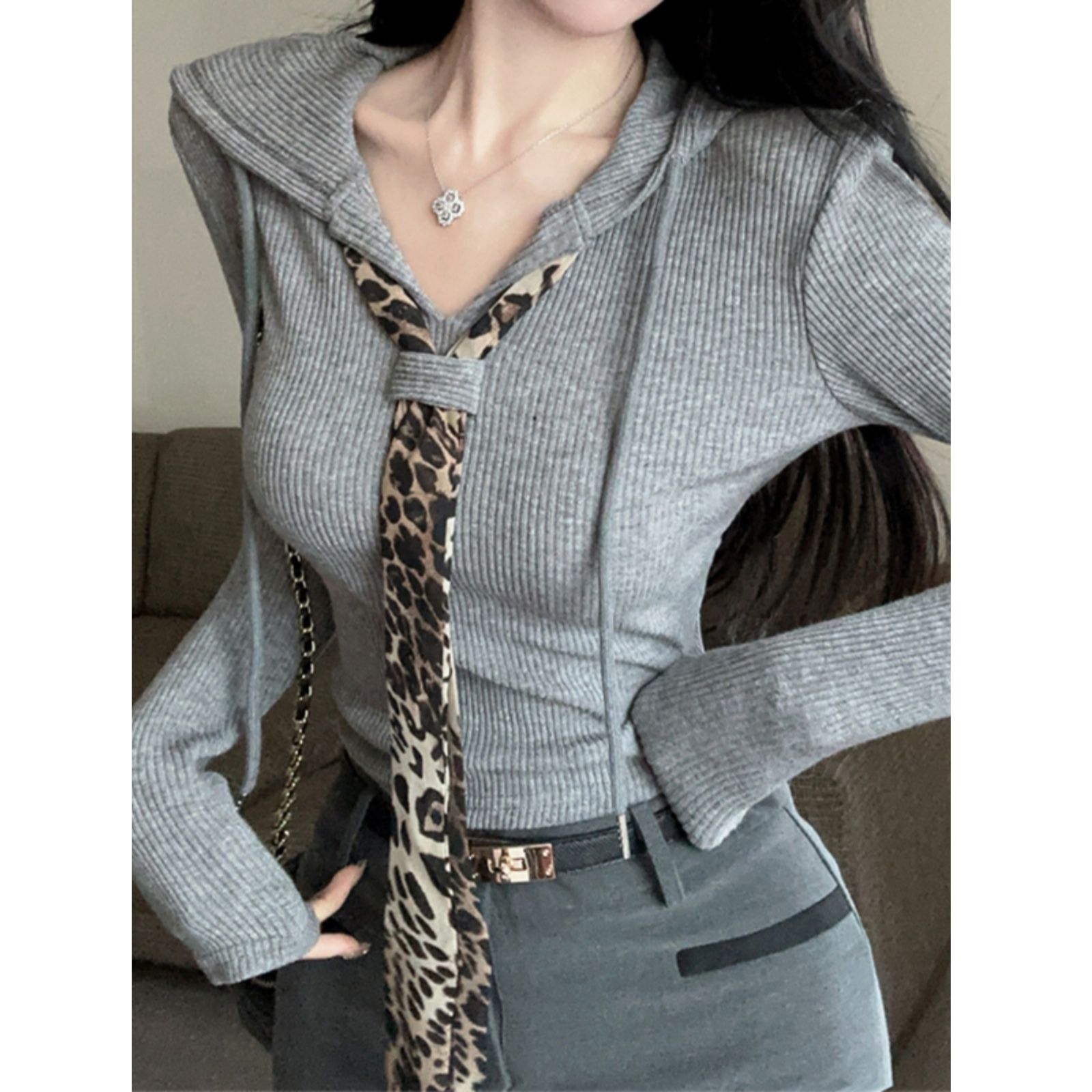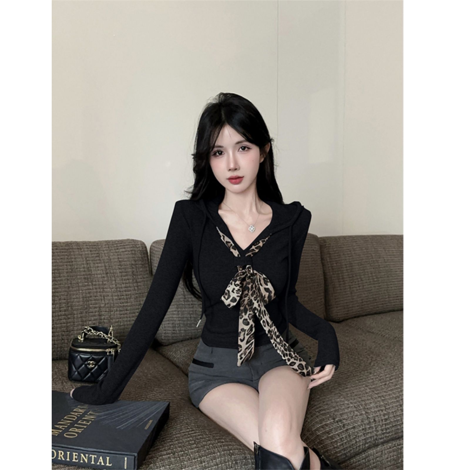 FA53440# 螺纹御姐V领豹纹领带拼接短长袖打底衫女秋辣妹连帽上衣 服裝批發女裝批發服飾貨源