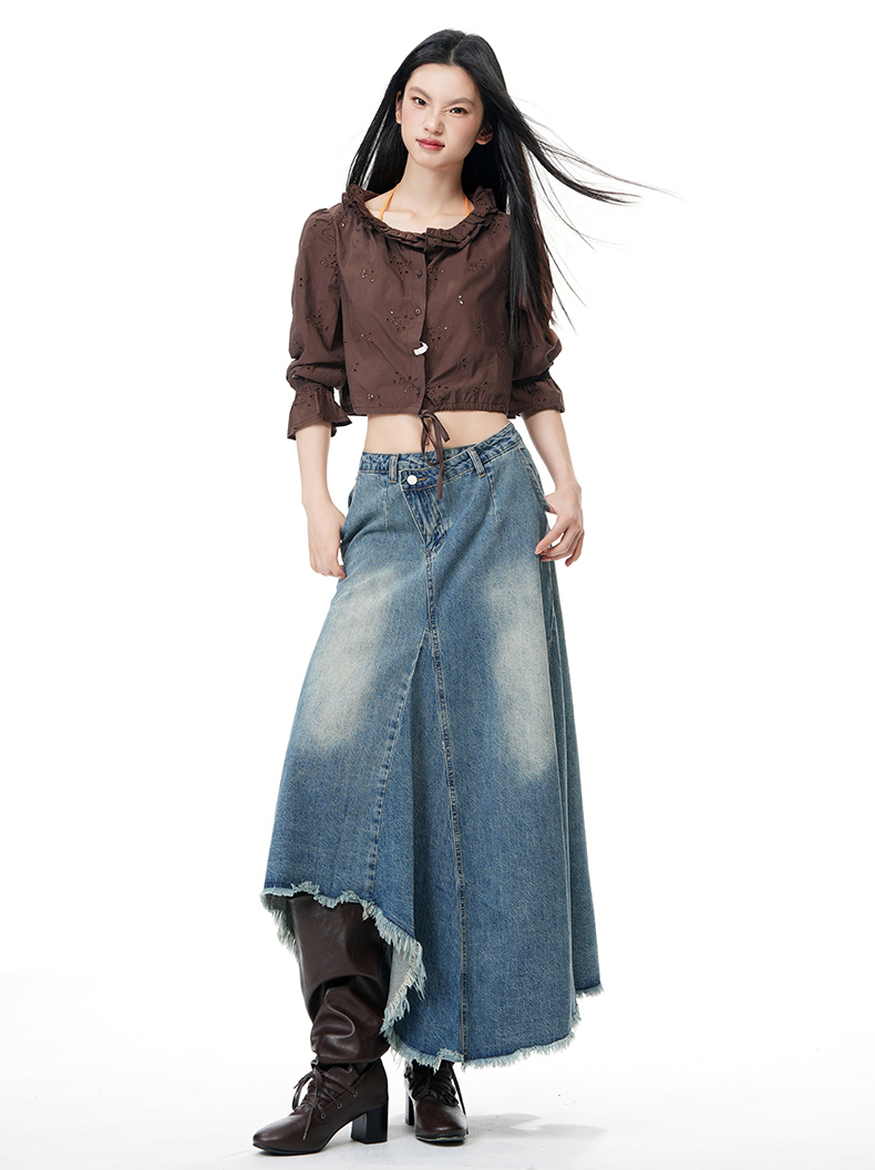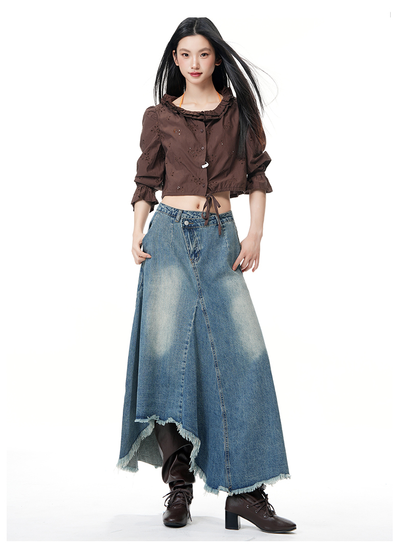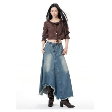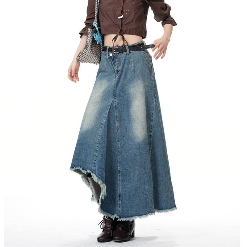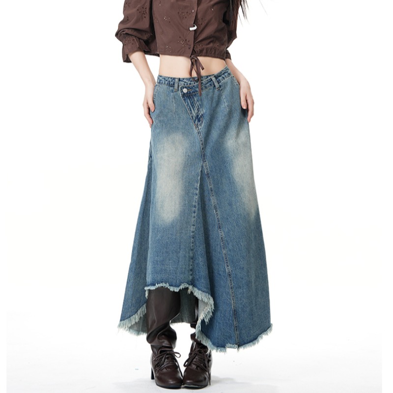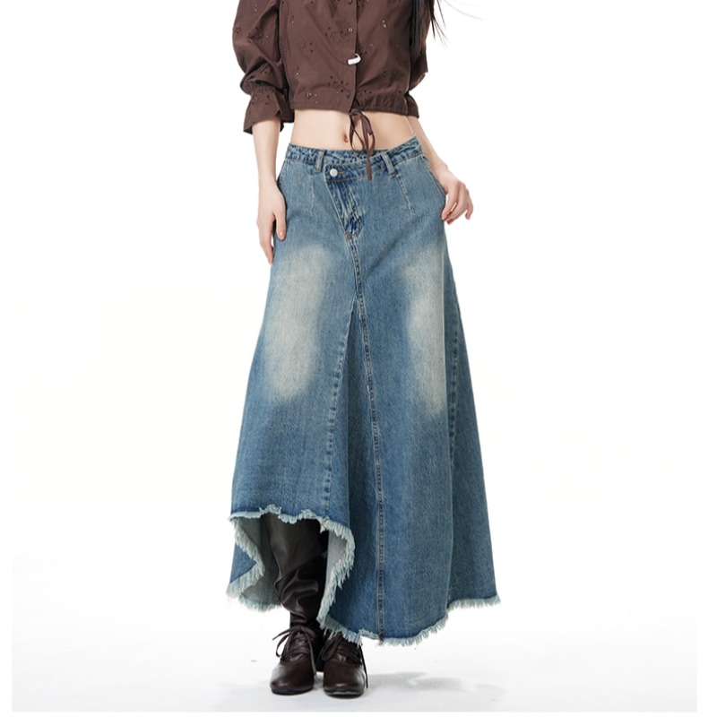 FA53472# 大码女装韩式复古不规则设计感牛仔半身裙女新款做旧a字长裙 服裝批發女裝批發服飾貨源