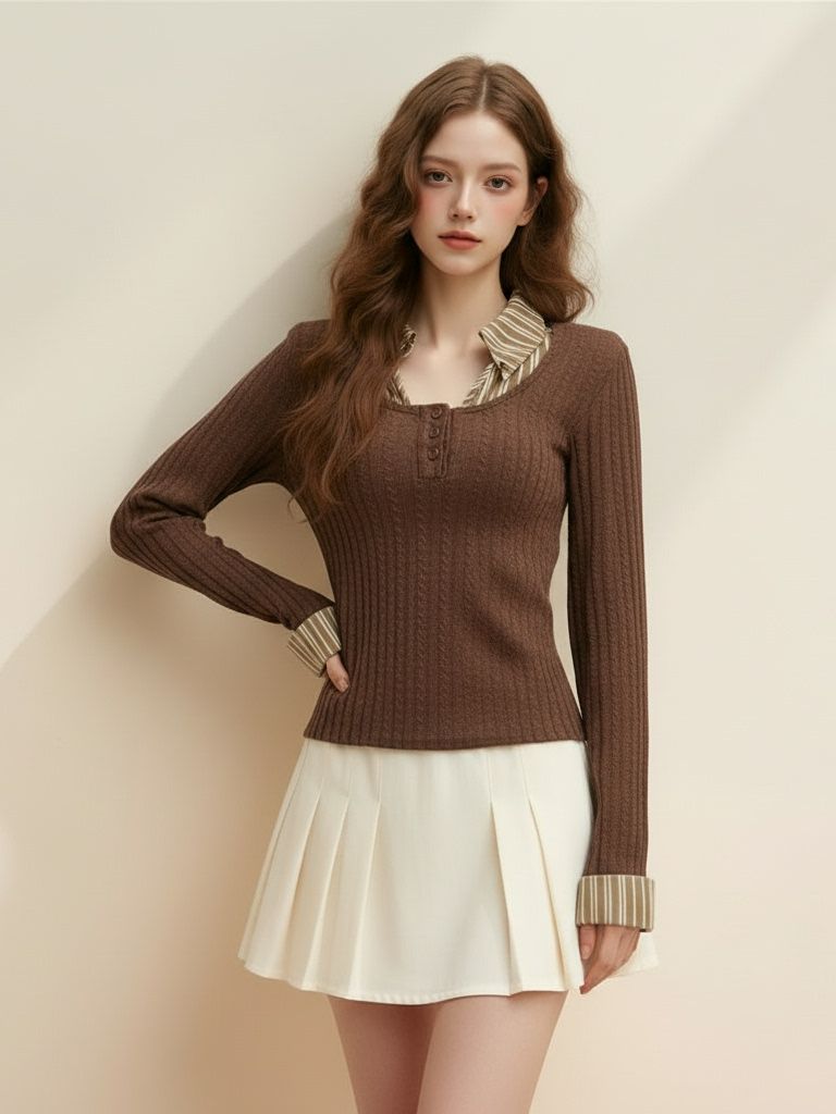 FA53793# 法式假两件长袖拼接条纹撞色衬衫领修身显瘦绞花上衣针织 服裝批發女裝批發服飾貨源