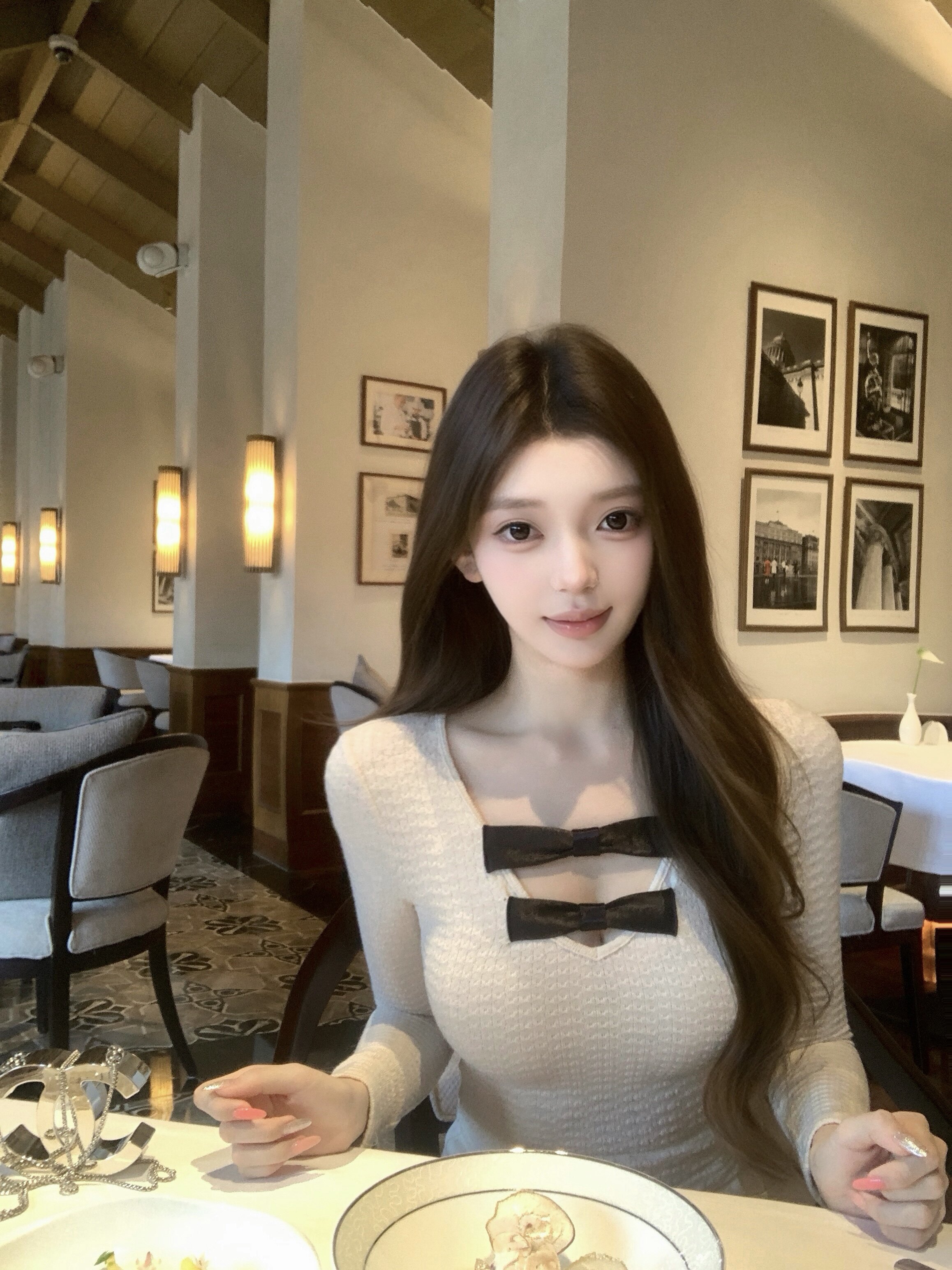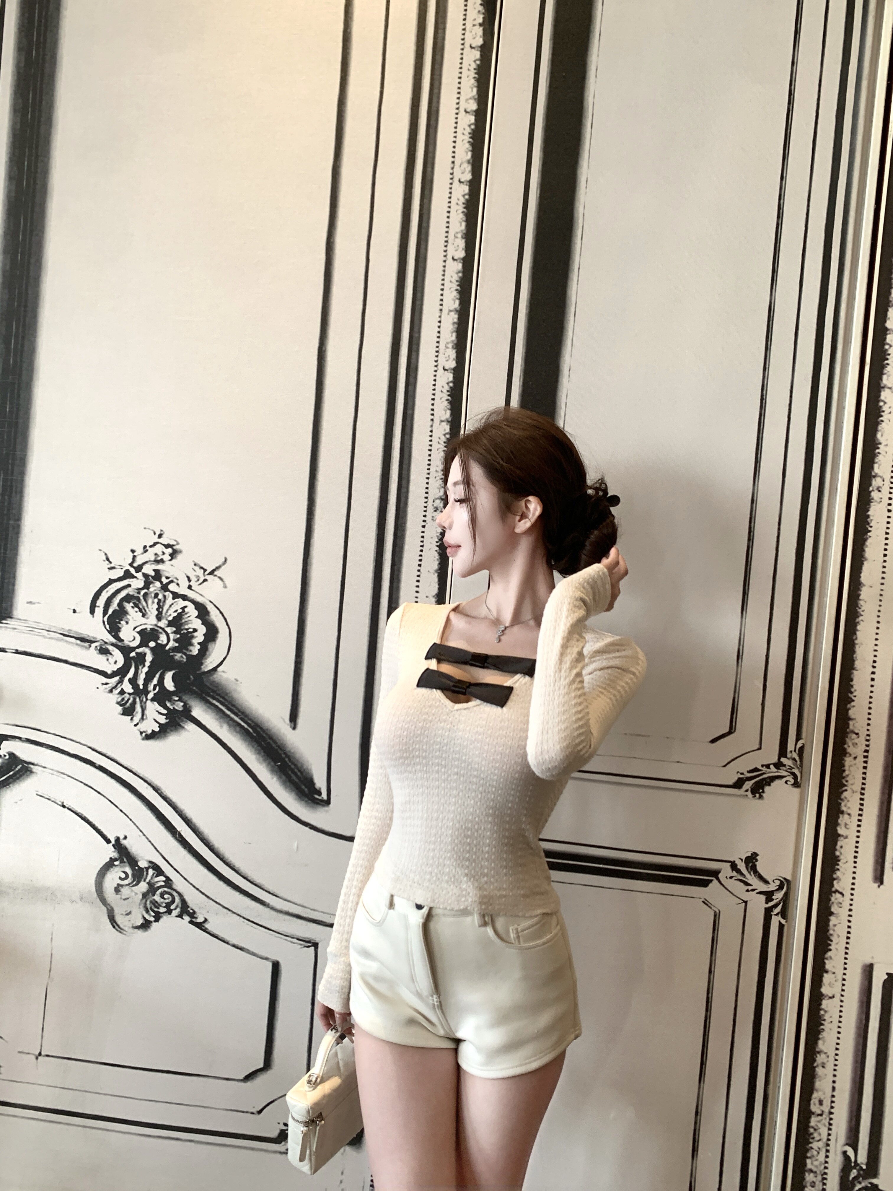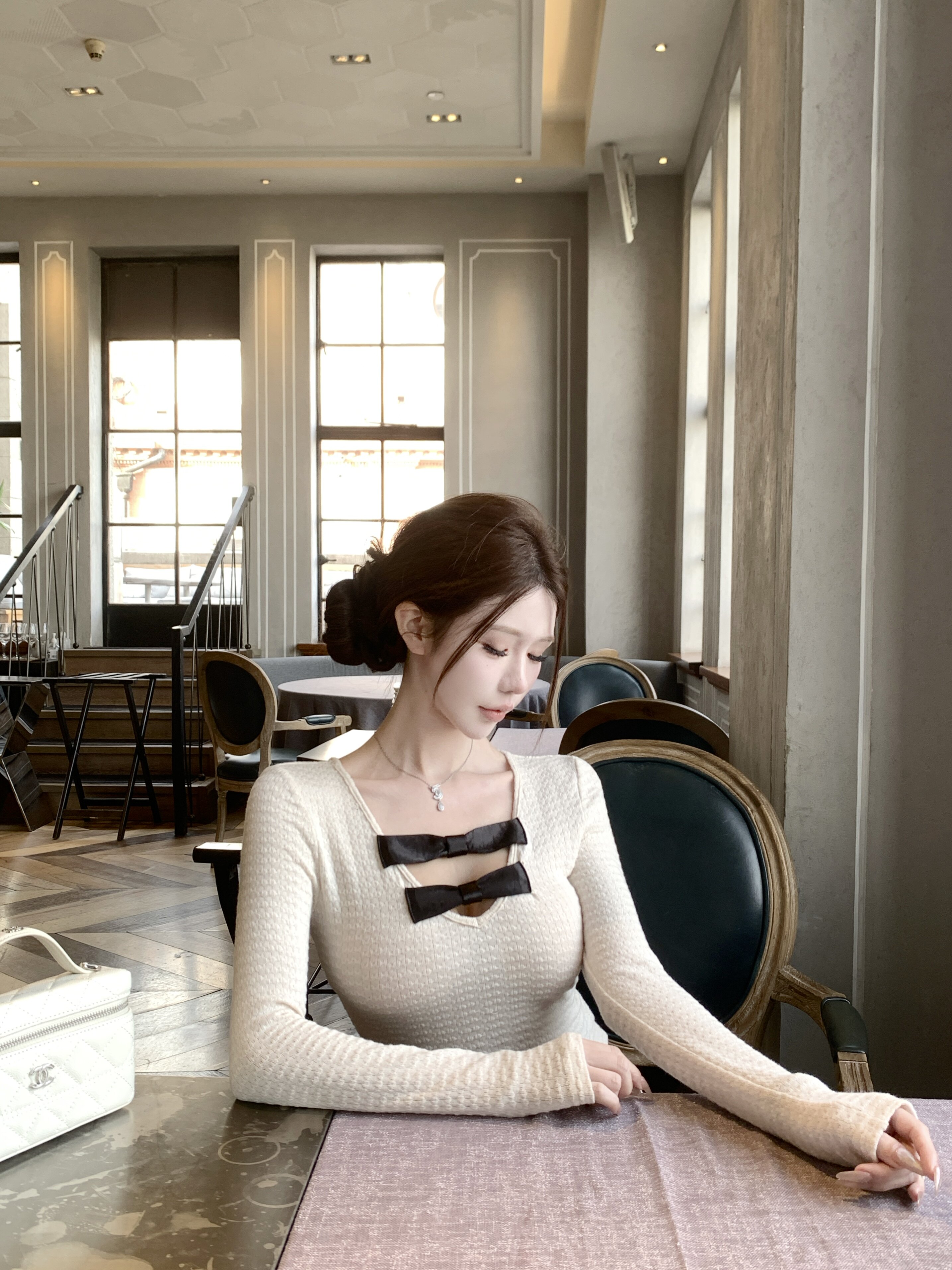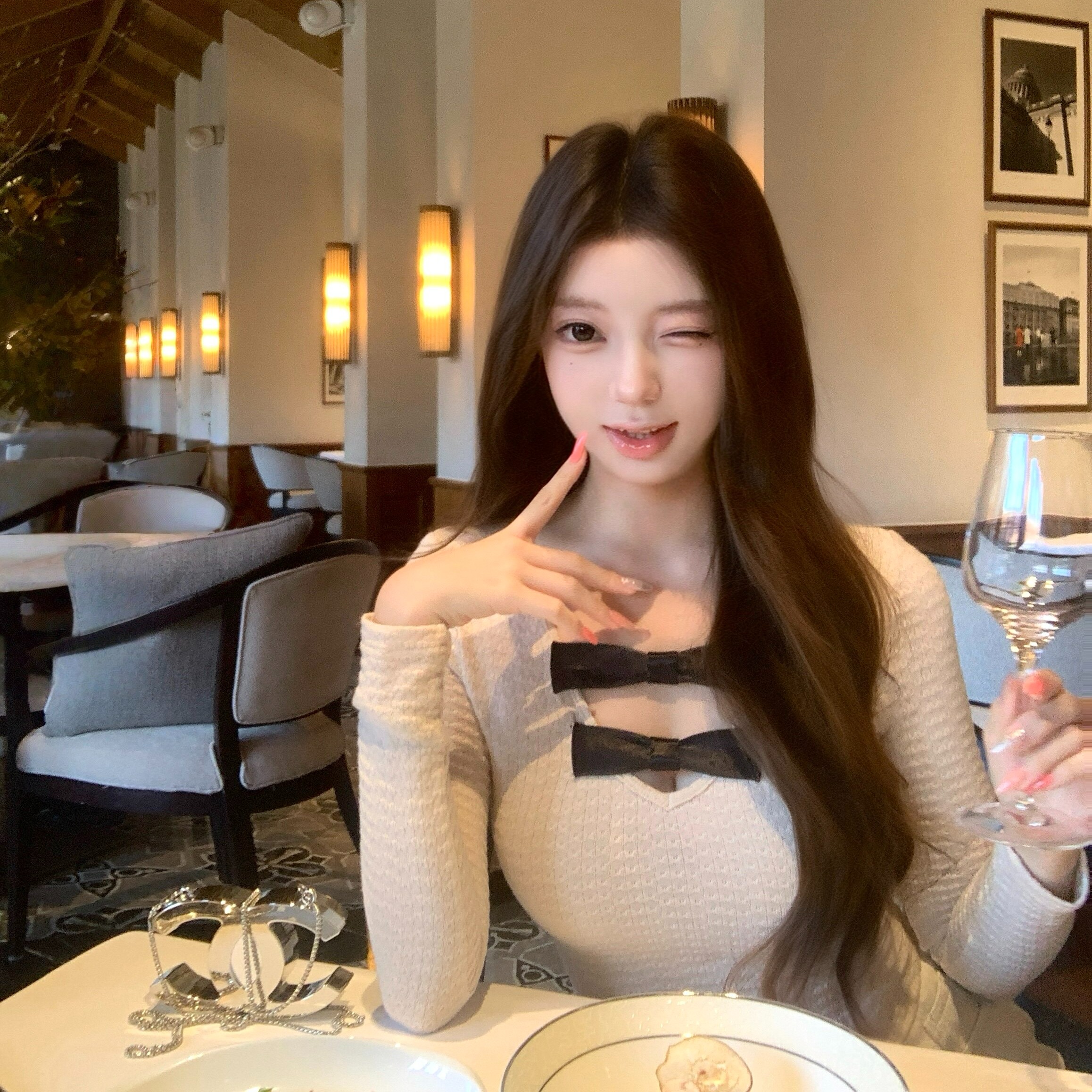 FA53795# 千金感丝绒蝴蝶结v领拼接长袖针织衫纯欲上衣 服裝批發女裝批發服飾貨源