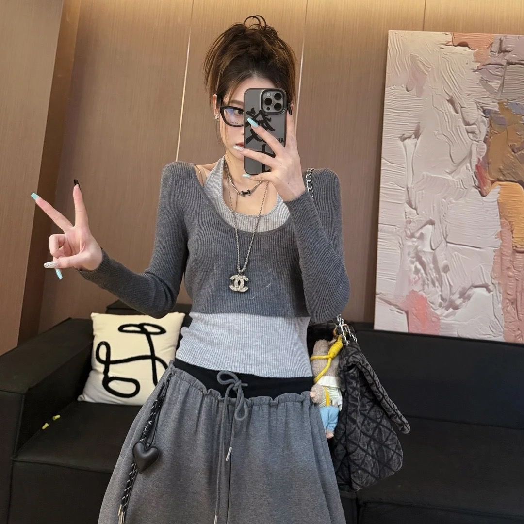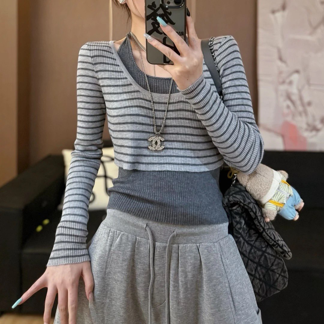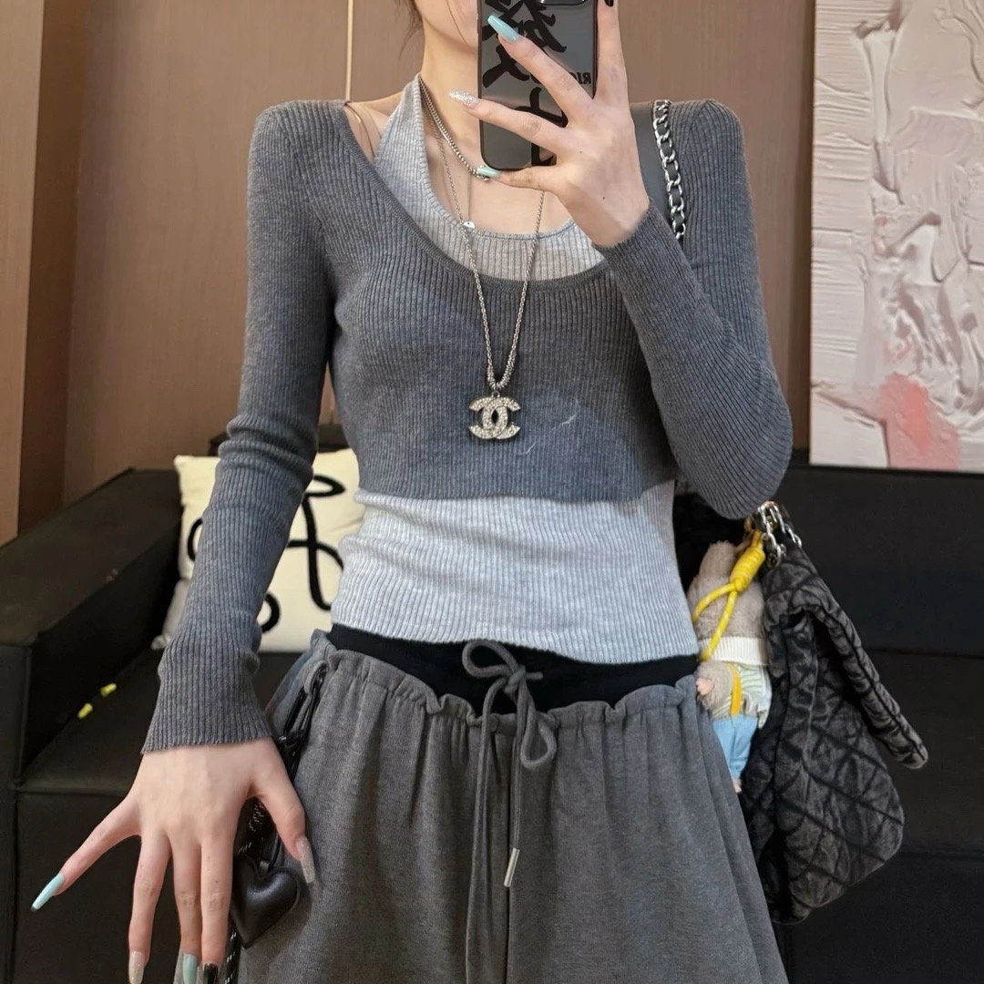 FA53807# 韩系灰色吊带挂脖长袖针织衫女春秋季修身显瘦叠穿内搭上衣两件套 服裝批發女裝批發服飾貨源