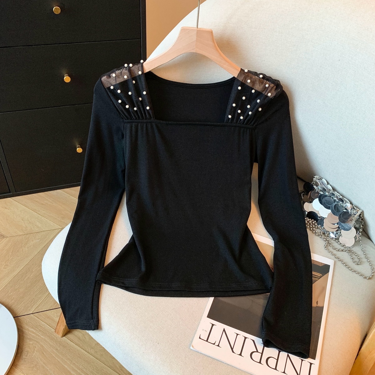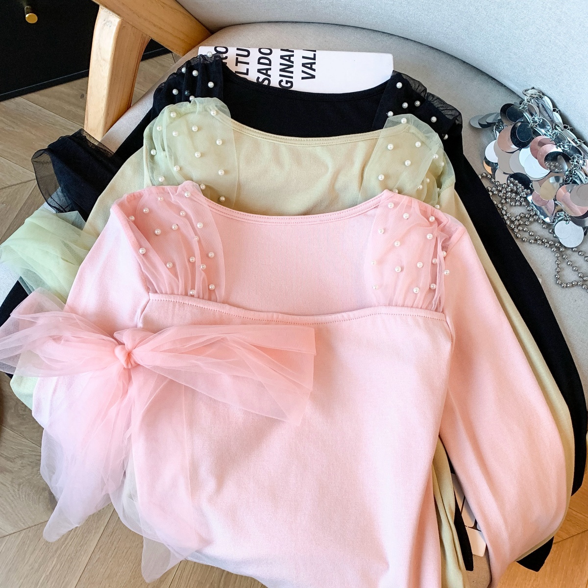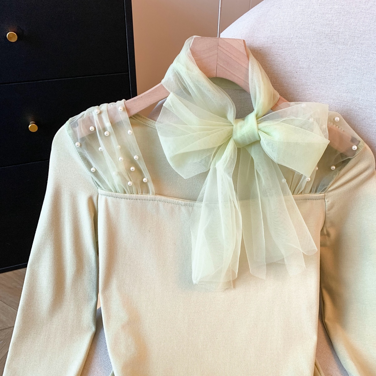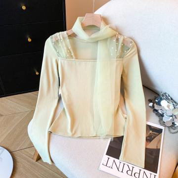 FA53837# 新款法式针织衫女冬网纱拼接气质飘带长袖打底衫 服裝批發女裝批發服飾貨源