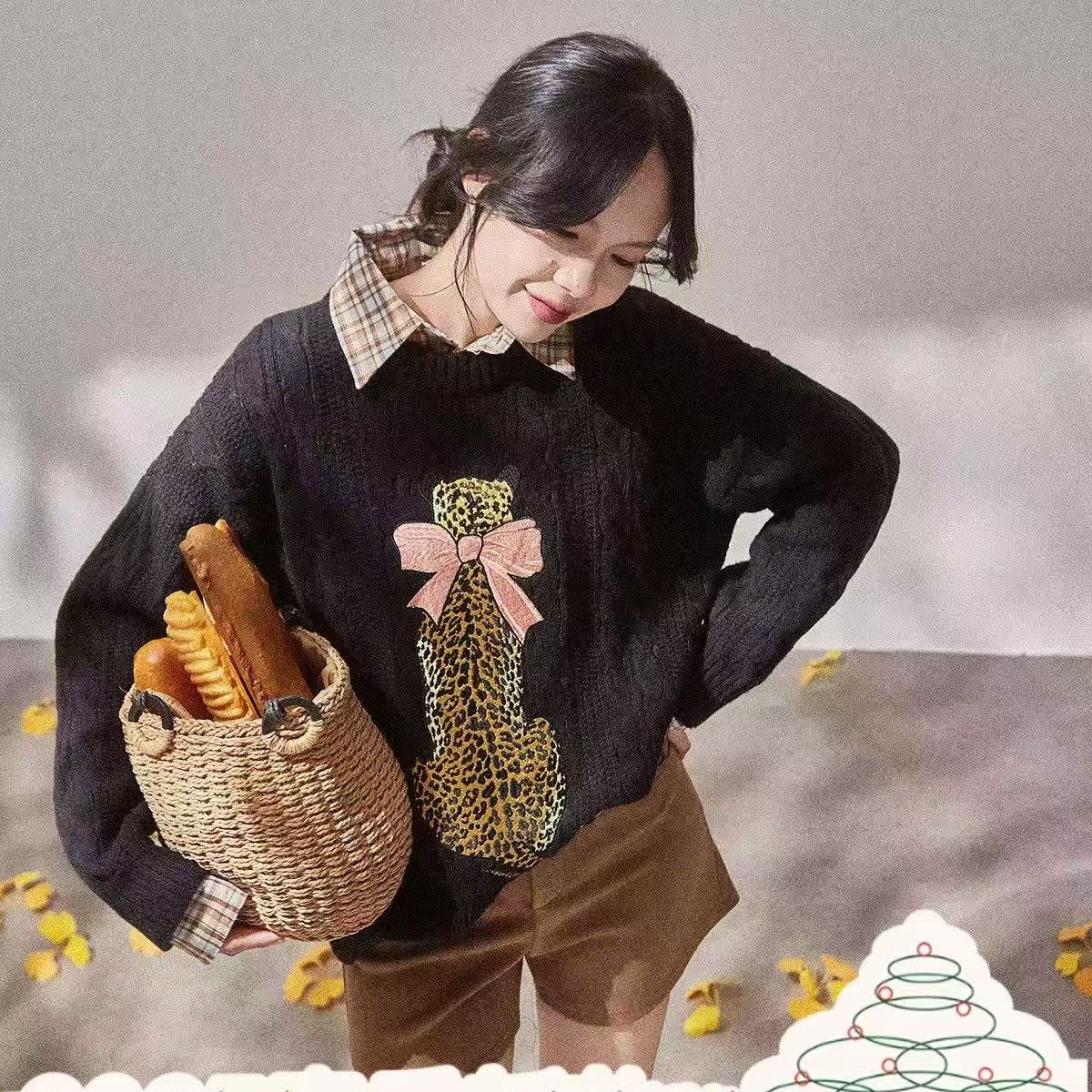FA53851# 韩系氛围感穿搭软糯糯猎豹蝴蝶结外套女冬季温柔风长袖上衣 服裝批發女裝批發服飾貨源