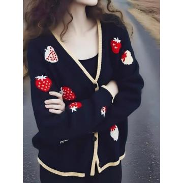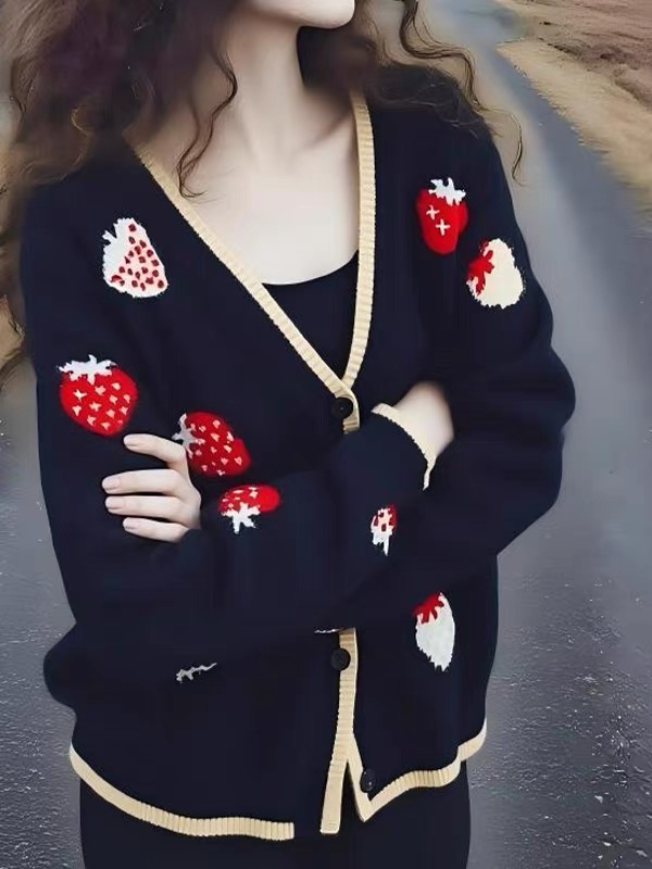 FA53947# 时尚可爱风V领草莓提花设计针织开衫女冬季长袖减龄百搭上衣外套 服裝批發女裝批發服飾貨源