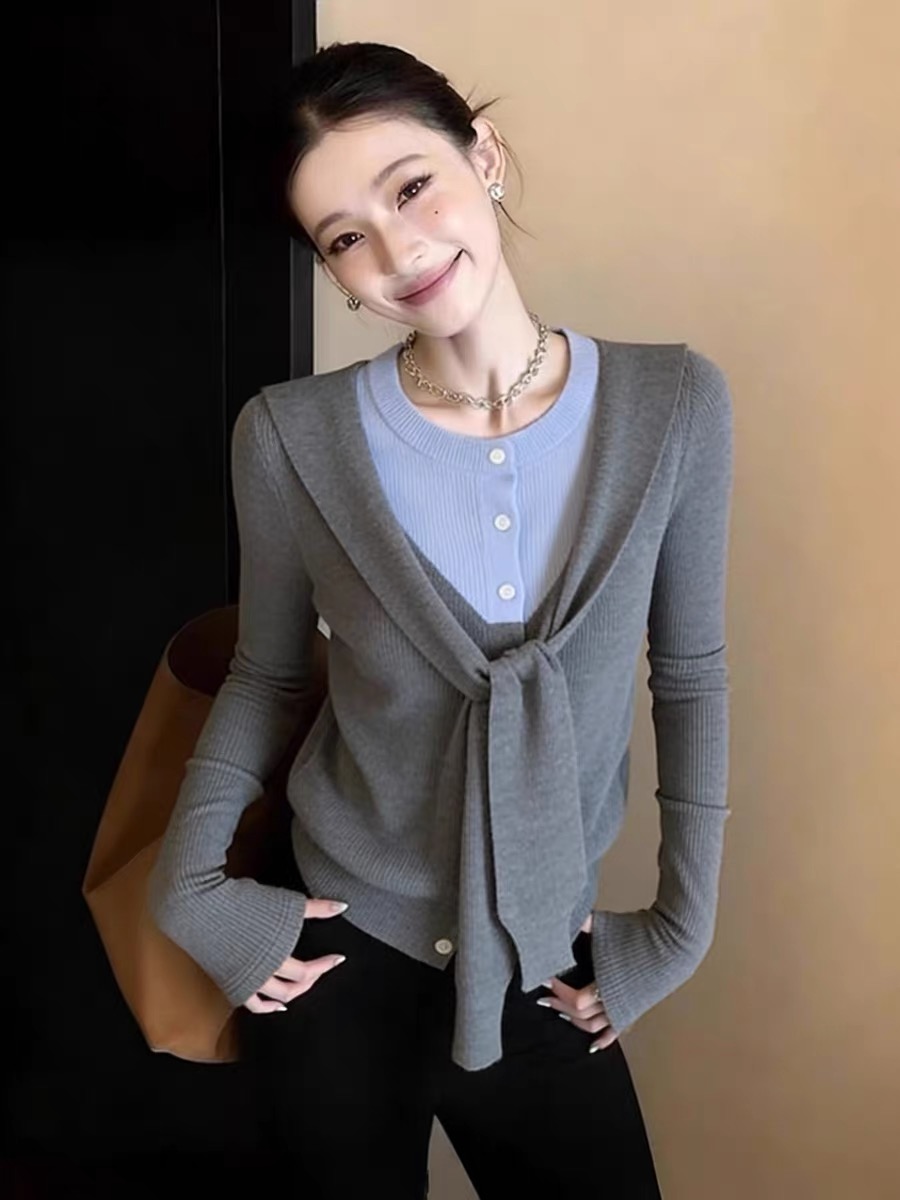 FA53948# 假两件拼色系带圆领长袖针织衫女秋冬休闲慵懒松弛感气质毛衣外套 服裝批發女裝批發服飾貨源
