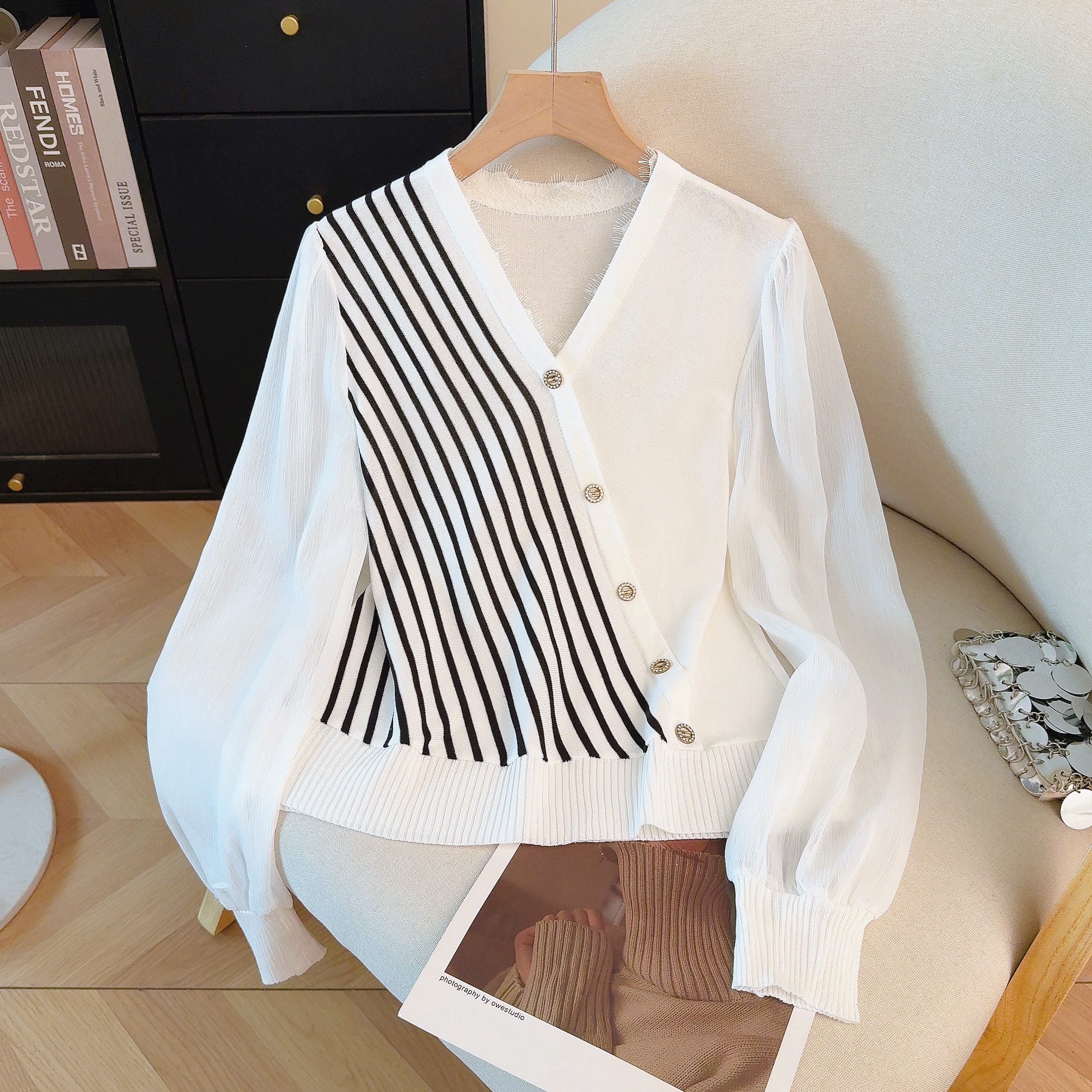 FA53950# 春季新款雪纺拼接针织衫V领蕾丝领口鸳鸯条纹上衣 服裝批發女裝批發服飾貨源