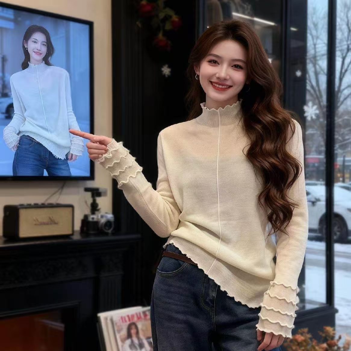 FA54056# 法式温柔木耳边半高领针织衫女高级感显瘦打底衫上衣 服裝批發女裝批發服飾貨源