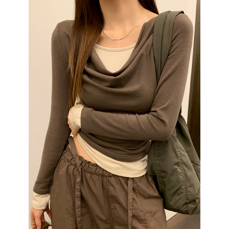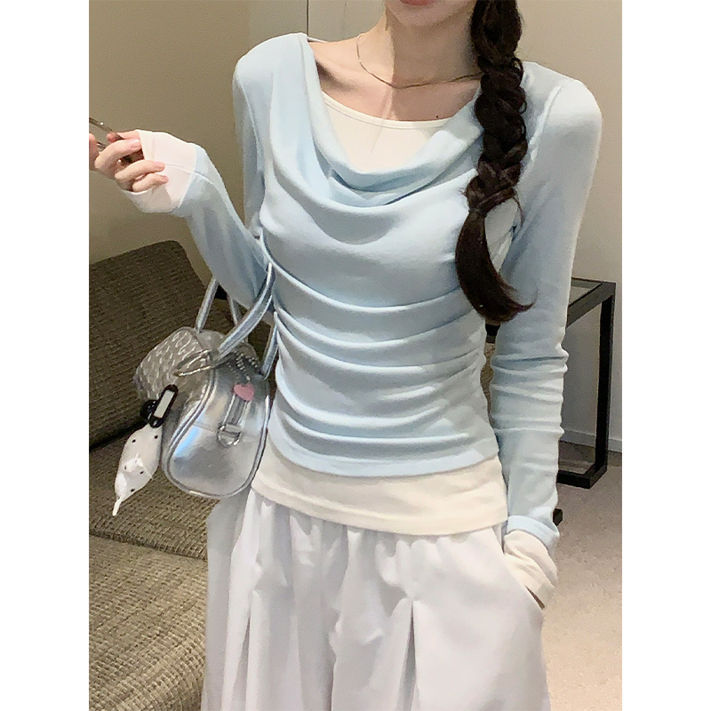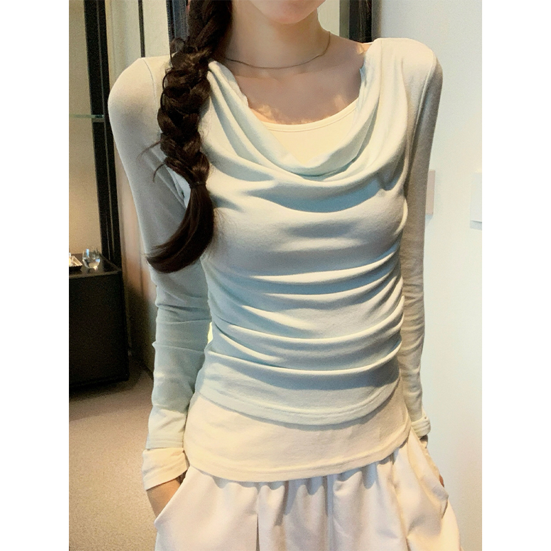 FA54891# 绿色荡领假两件长袖t恤女收腰秋季上衣女内搭打底衫 服裝批發女裝批發服飾貨源