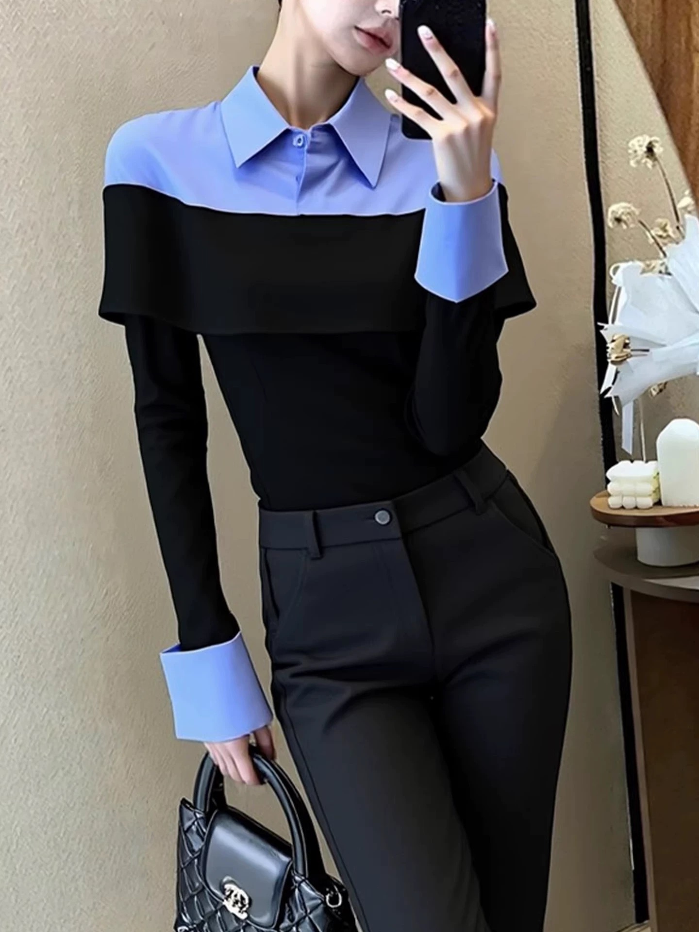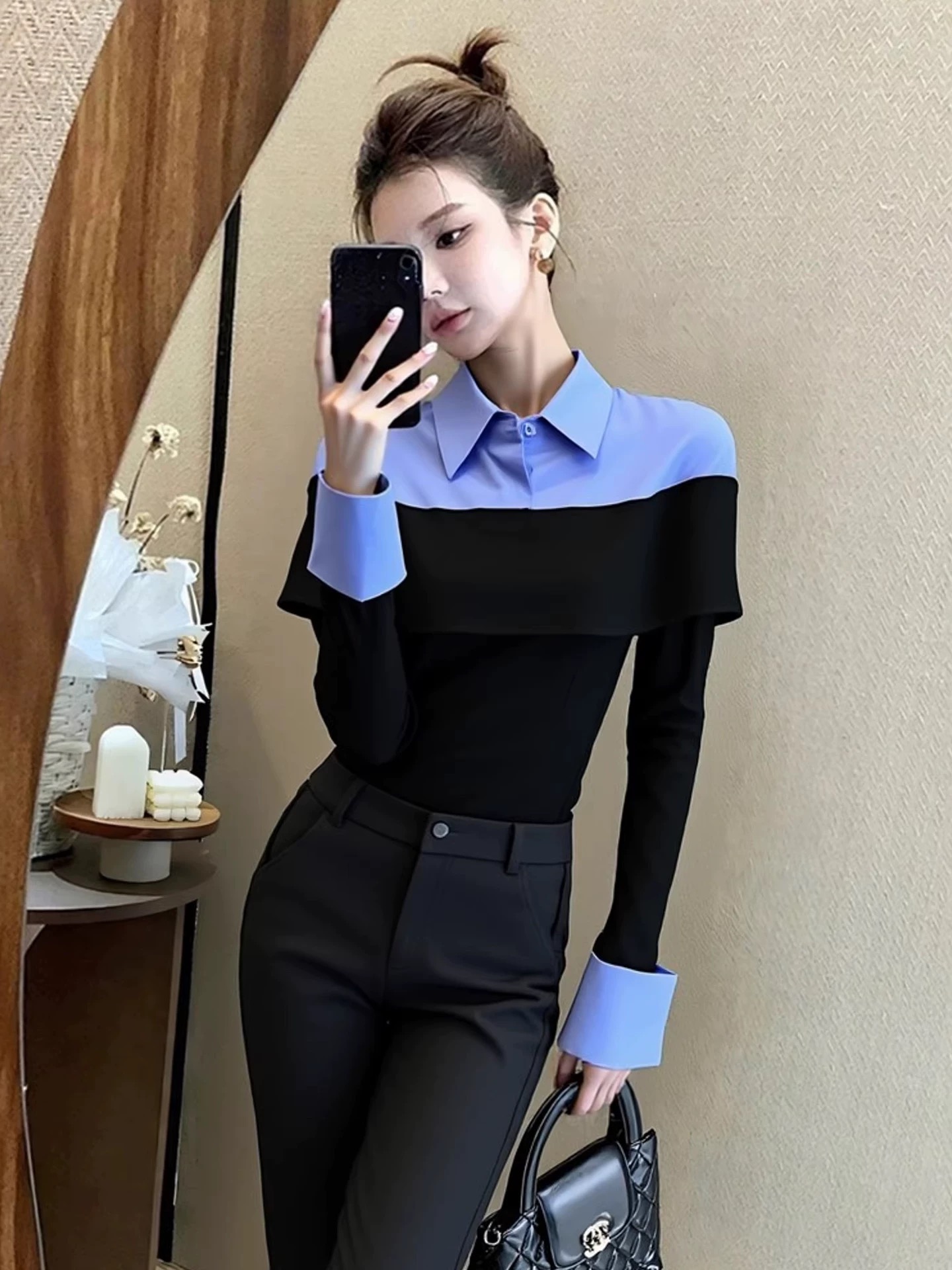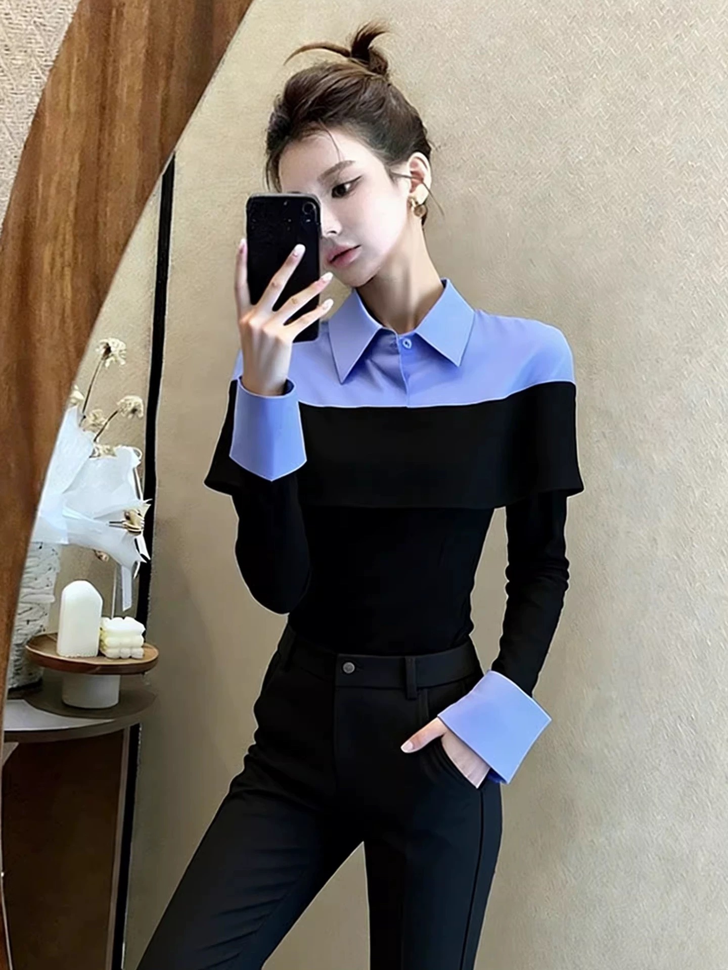 FA54913# 韩系时尚假两件撞色polo领长袖衬衫女春季新款修身显瘦上衣潮 服裝批發女裝批發服飾貨源