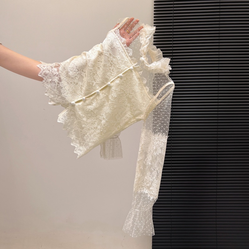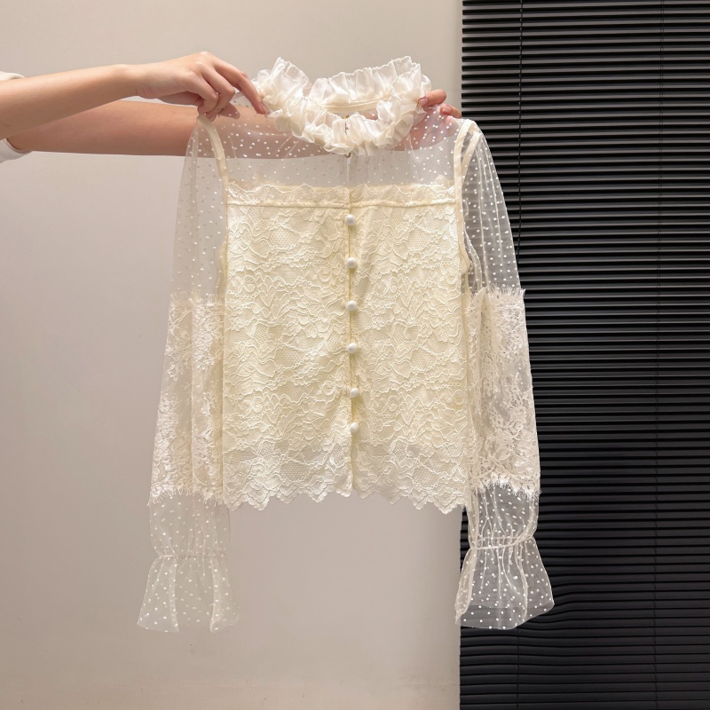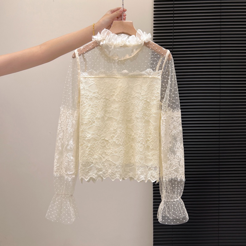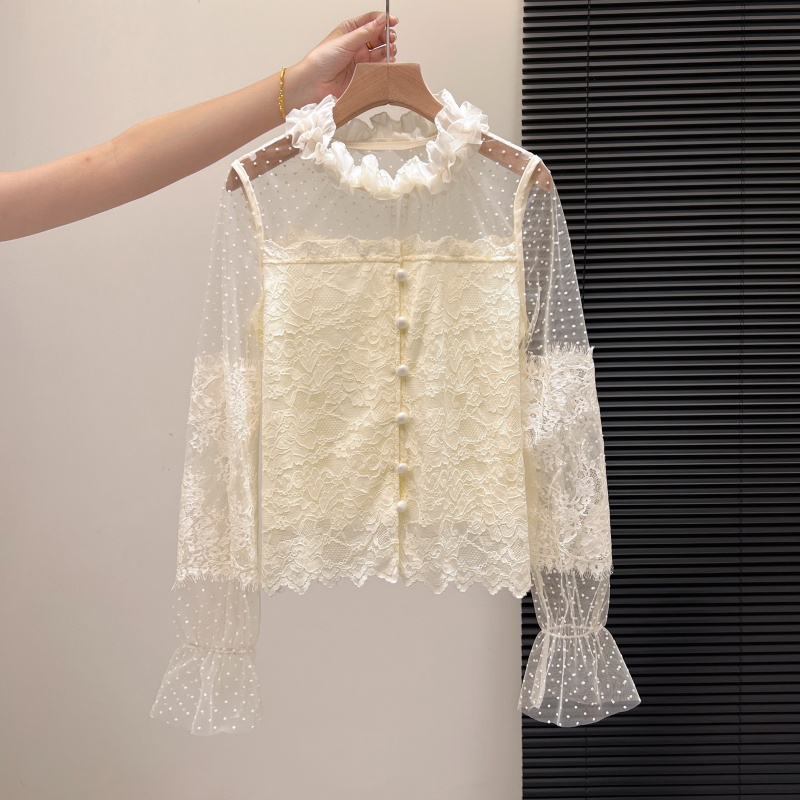 FA55153# 法式纯欲辣妹春款蕾丝打底衬衫女设计感网纱拼接修身长袖上衣 服裝批發女裝批發服飾貨源