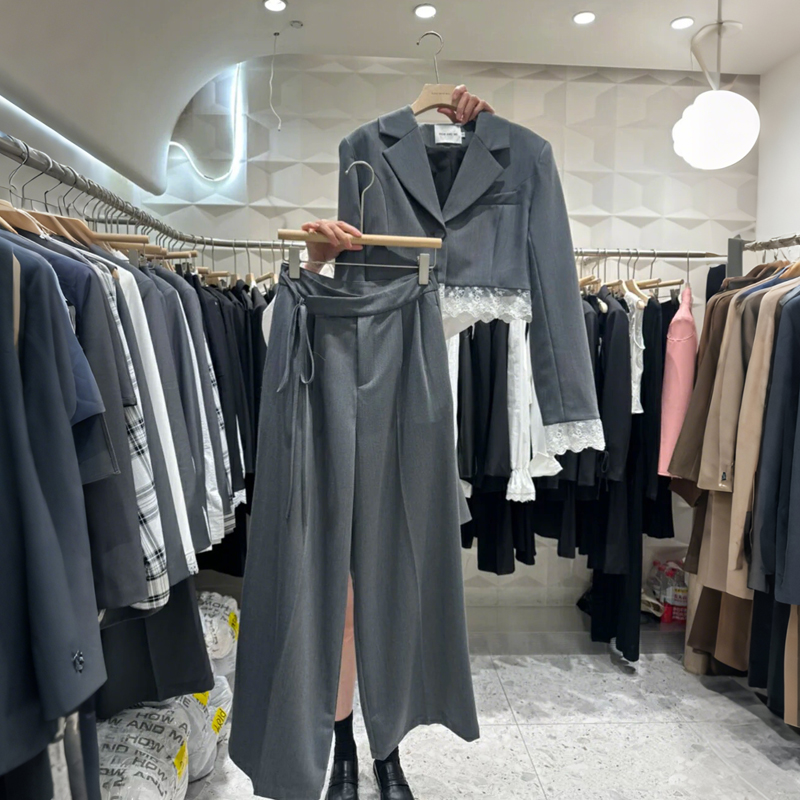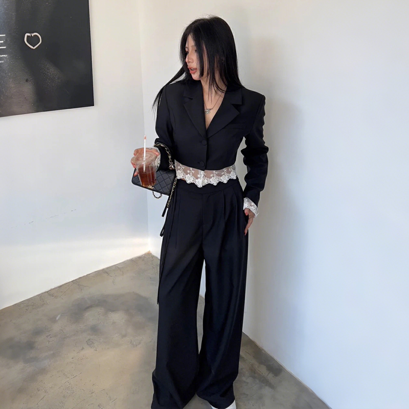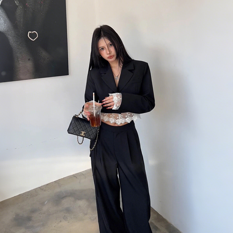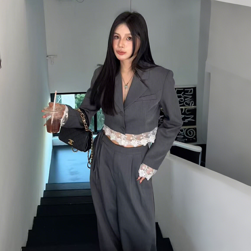 FA55245# 春季新款设计感小众蕾丝拼接西装外套高腰阔腿裤春装两件套 服裝批發女裝批發服飾貨源