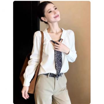 FA55286# 法式高级感领巾拼接白色衬衫女小众独特慵懒百搭绝美长袖上衣秋冬 服裝批發女裝批發服飾貨源