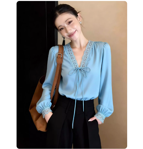 FA55287# 法式复古气质蓝色蕾丝拼接系带灯笼袖上衣春季新款衬衫百搭女 服裝批發女裝批發服飾貨源