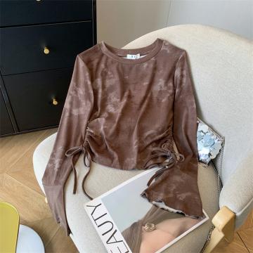甜辣妹扎染抽绳喇叭袖上衣纯欲长袖T恤 服裝批發女裝批發服飾貨源