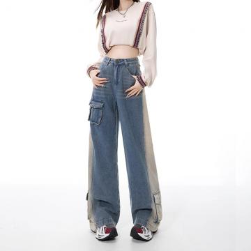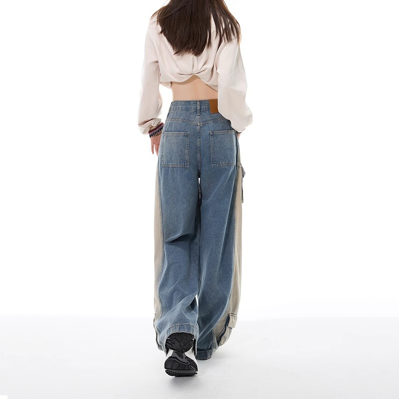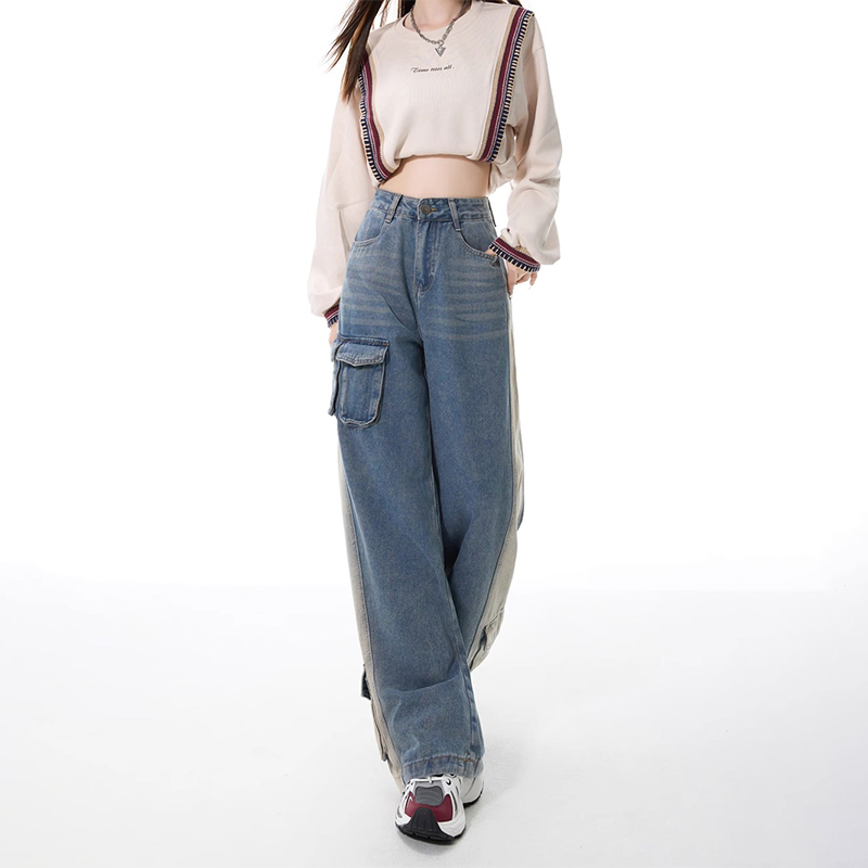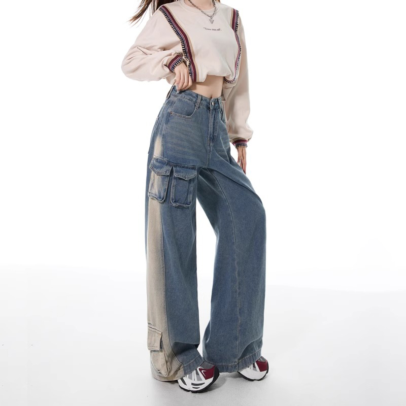 FA55508# 新款重工立体口袋美式复古水洗黄直筒工装酷帅牛仔裤女阔腿裤 服裝批發女裝批發服飾貨源