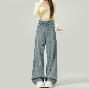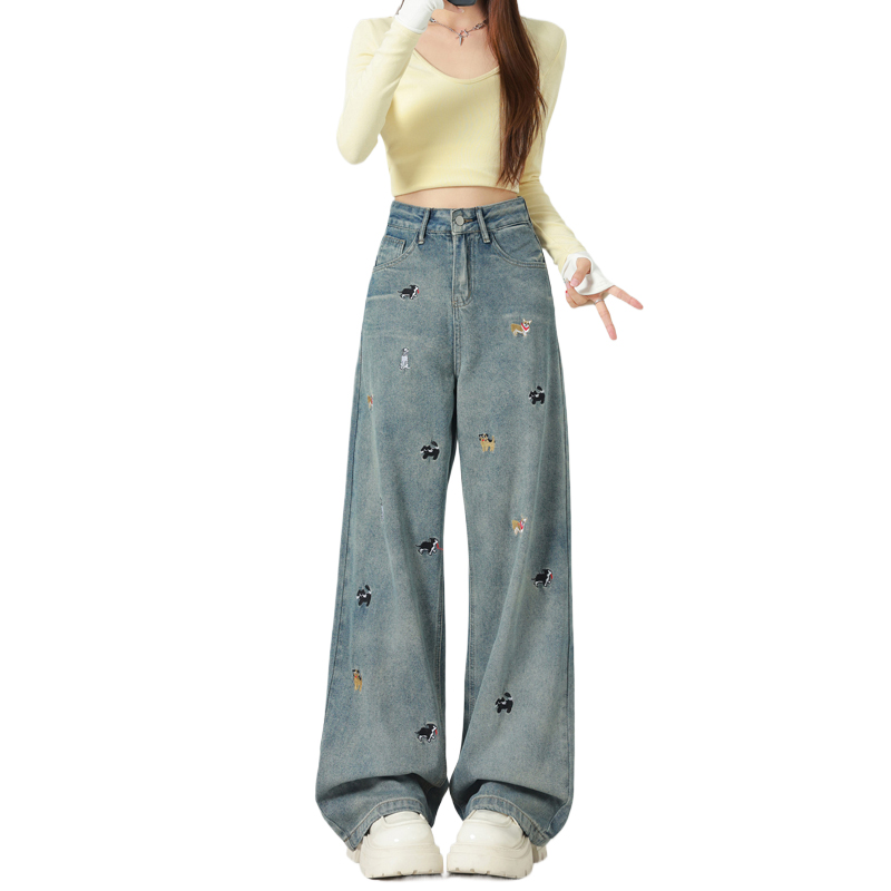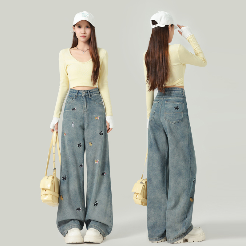 FA55552# 春秋小狗刺绣宽松显瘦高腰阔腿牛仔裤女百搭直筒拖地长裤 服裝批發女裝批發服飾貨源