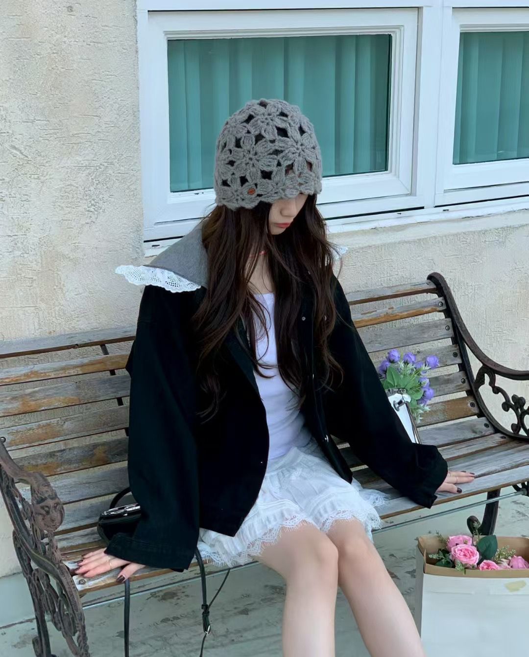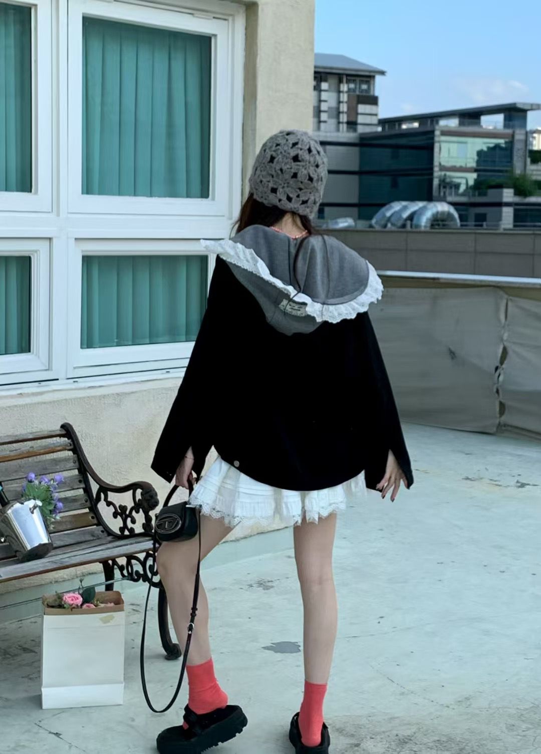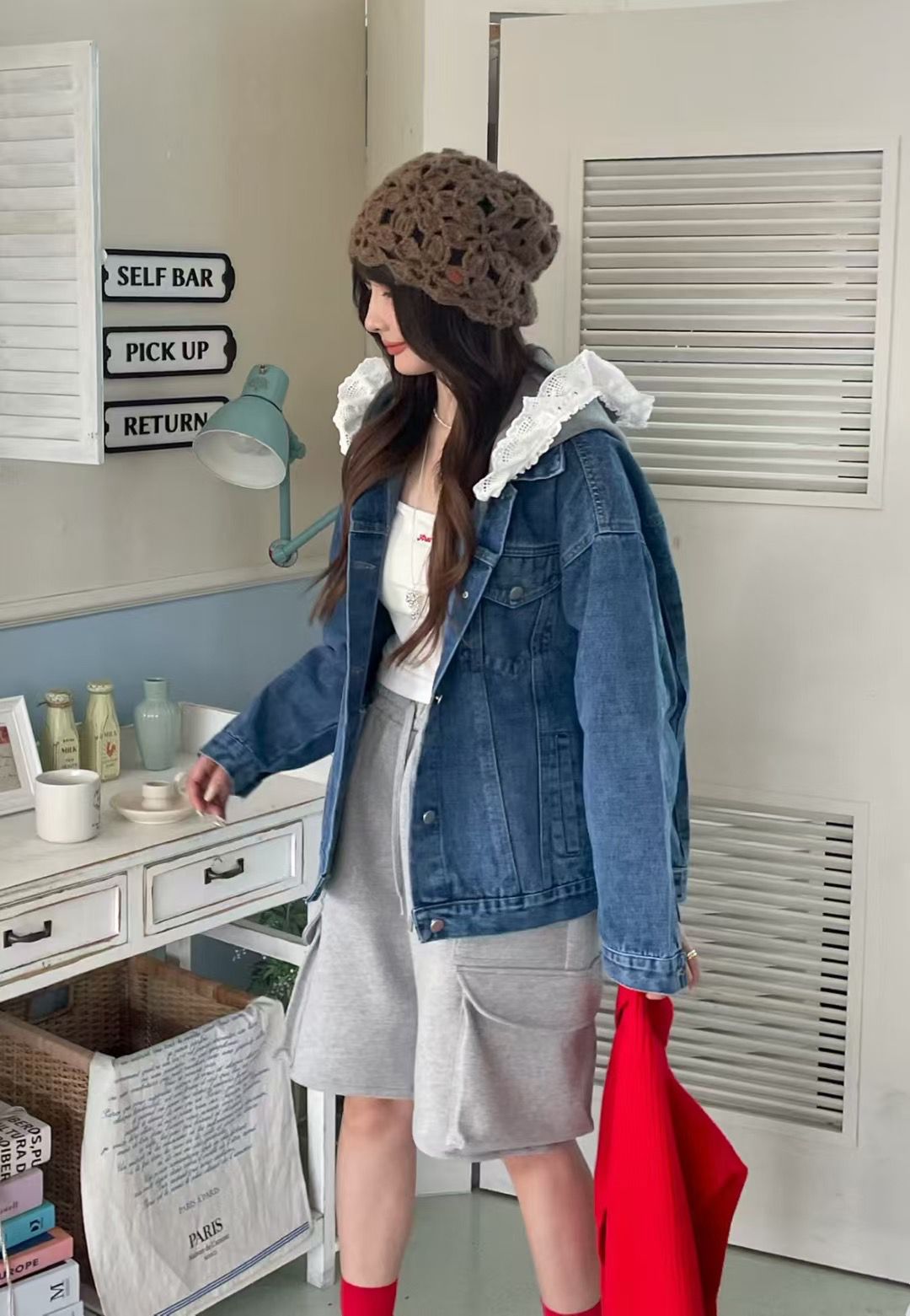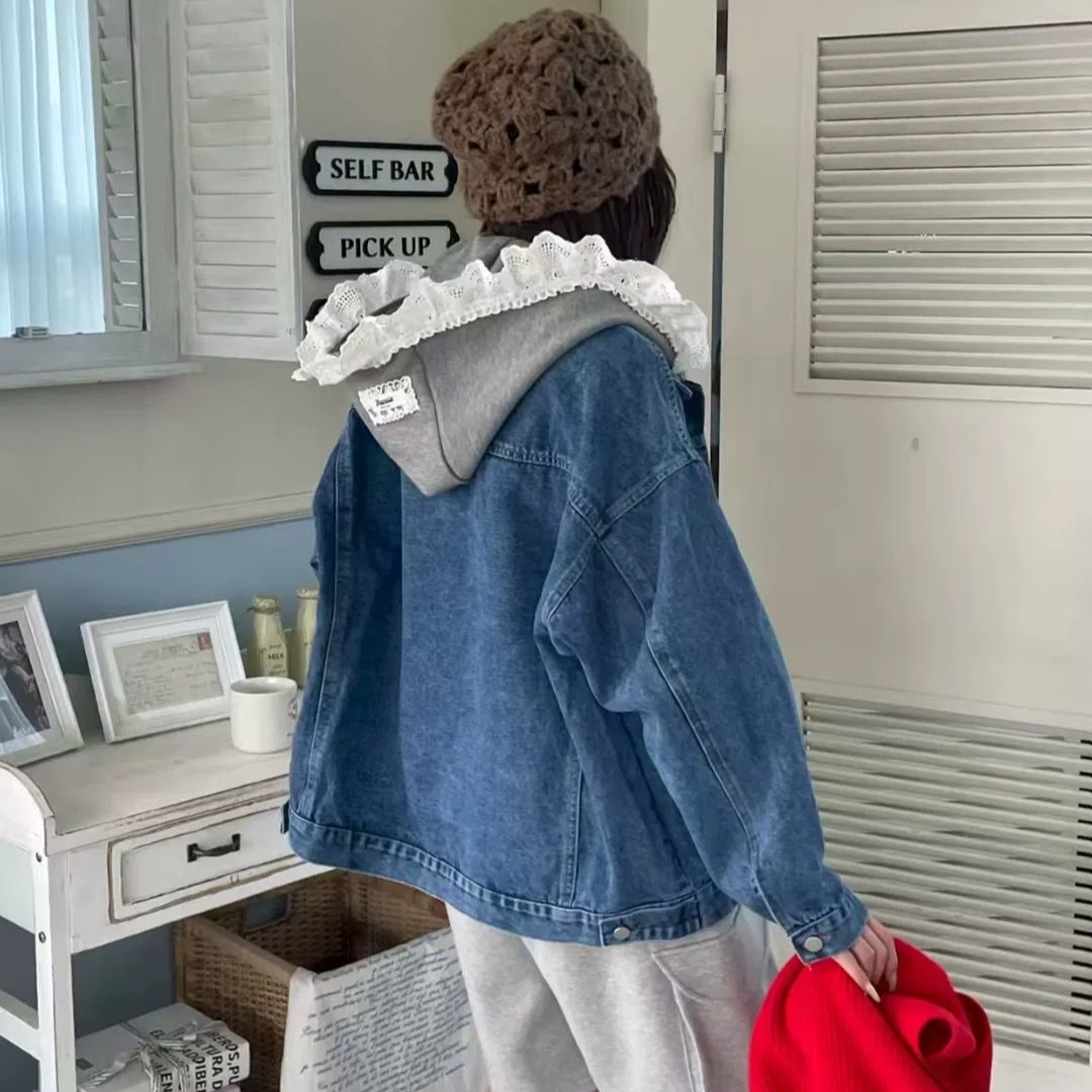 FA55634# INS韩国东大门秋季拼接蕾丝花边可拆卸连帽牛仔外套大衣 服裝批發女裝批發服飾貨源