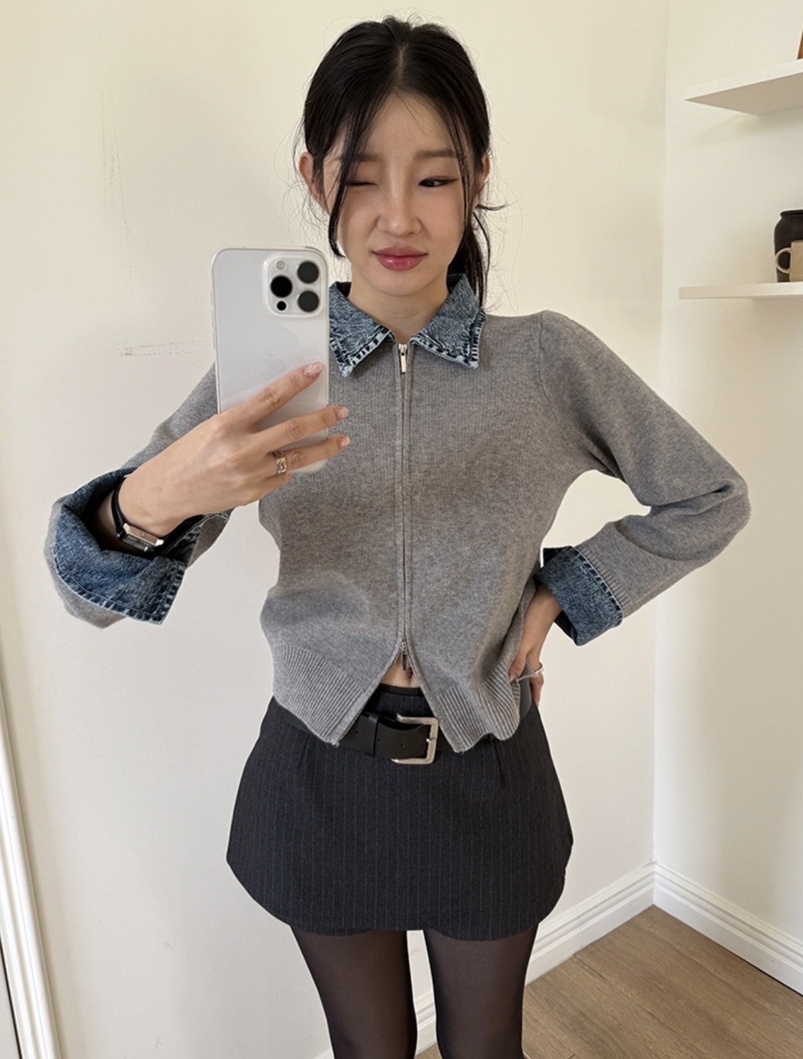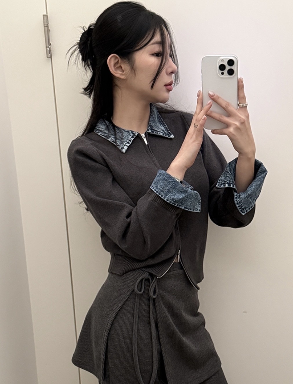 FA55635# chic韩国东大门春季新款牛仔拼接翻领拉链针织开衫毛衣外套 服裝批發女裝批發服飾貨源
