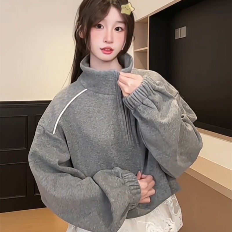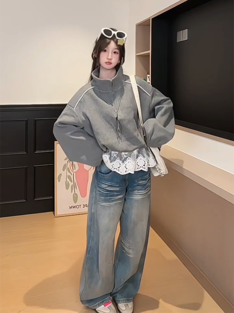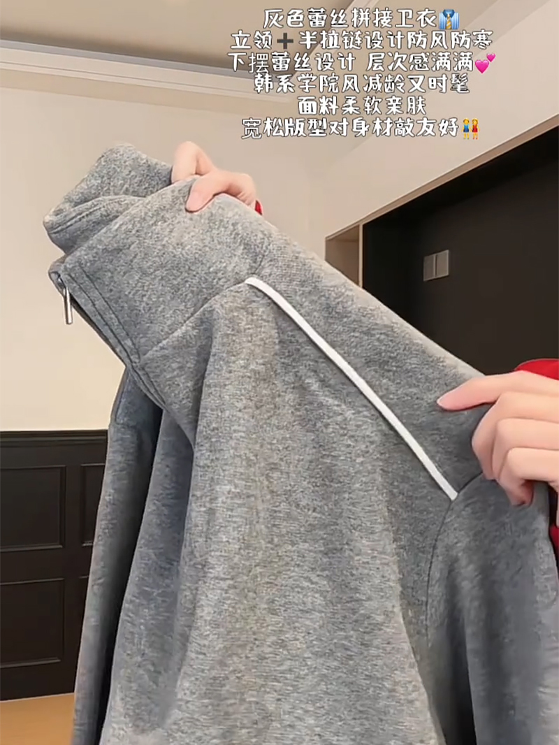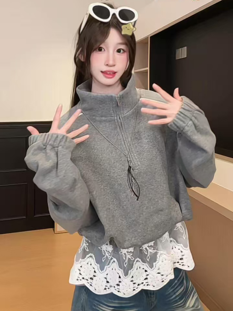 FA56171# 薄款卫衣女春秋薄拉链新款蕾丝假两件宽松纯色立领上衣 服裝批發女裝批發服飾貨源