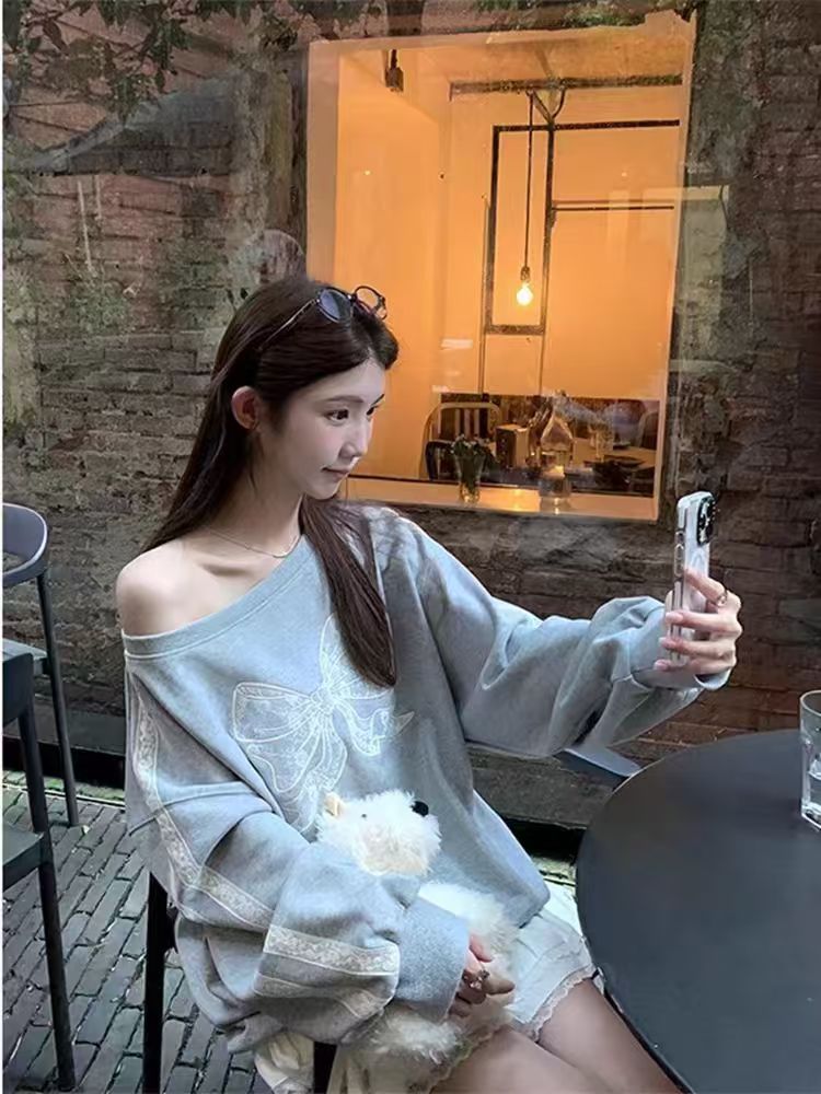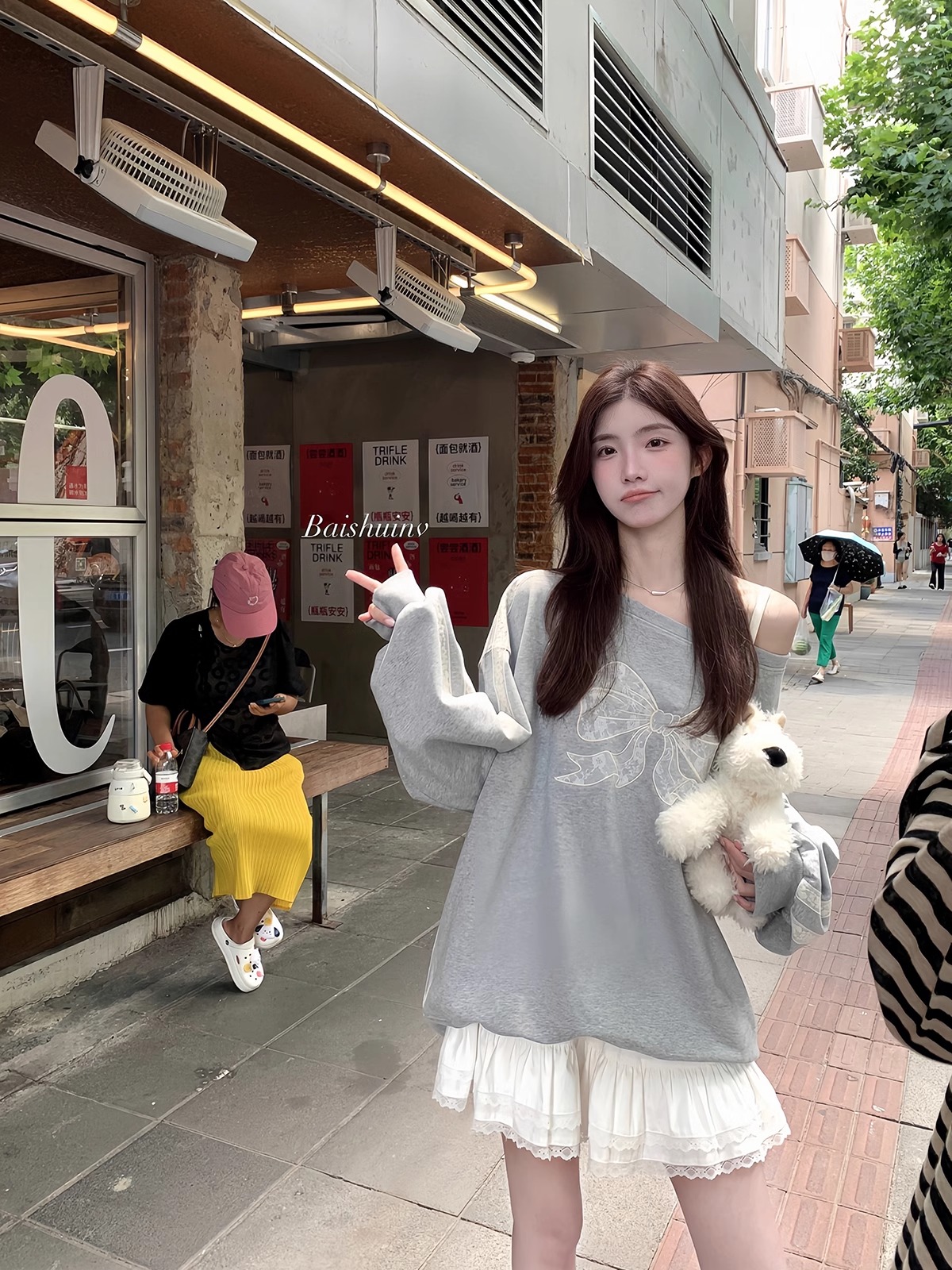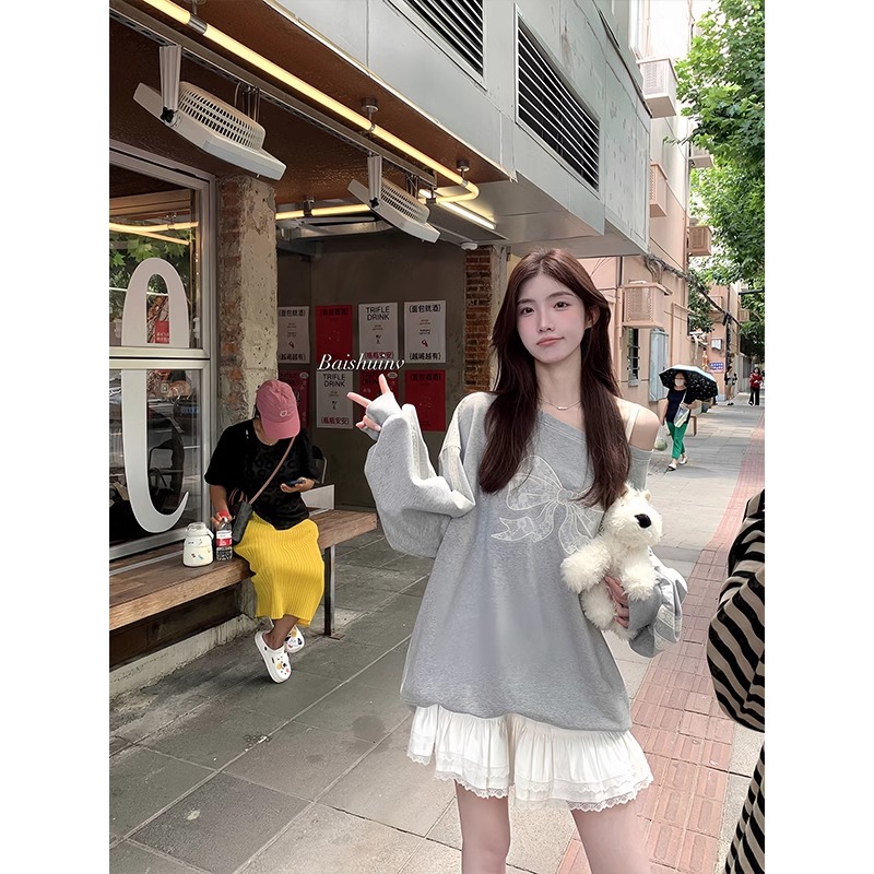 FA56188# 仿棉华棉复合春秋款蕾丝花边设计感灰色气质卫衣女 服裝批發女裝批發服飾貨源