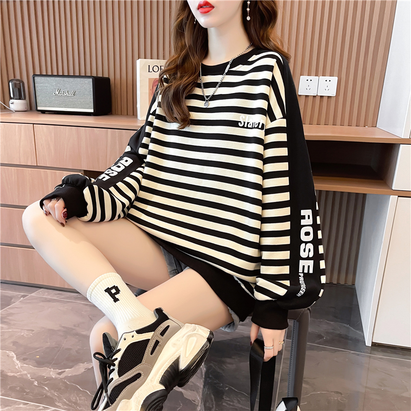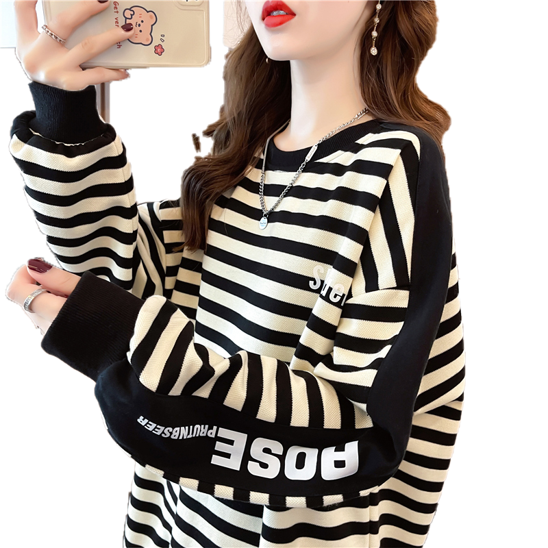 FA56195# 棉质大码女装春秋薄长袖卫衣女韩版宽松珠地条纹设计感上衣 服裝批發女裝批發服飾貨源