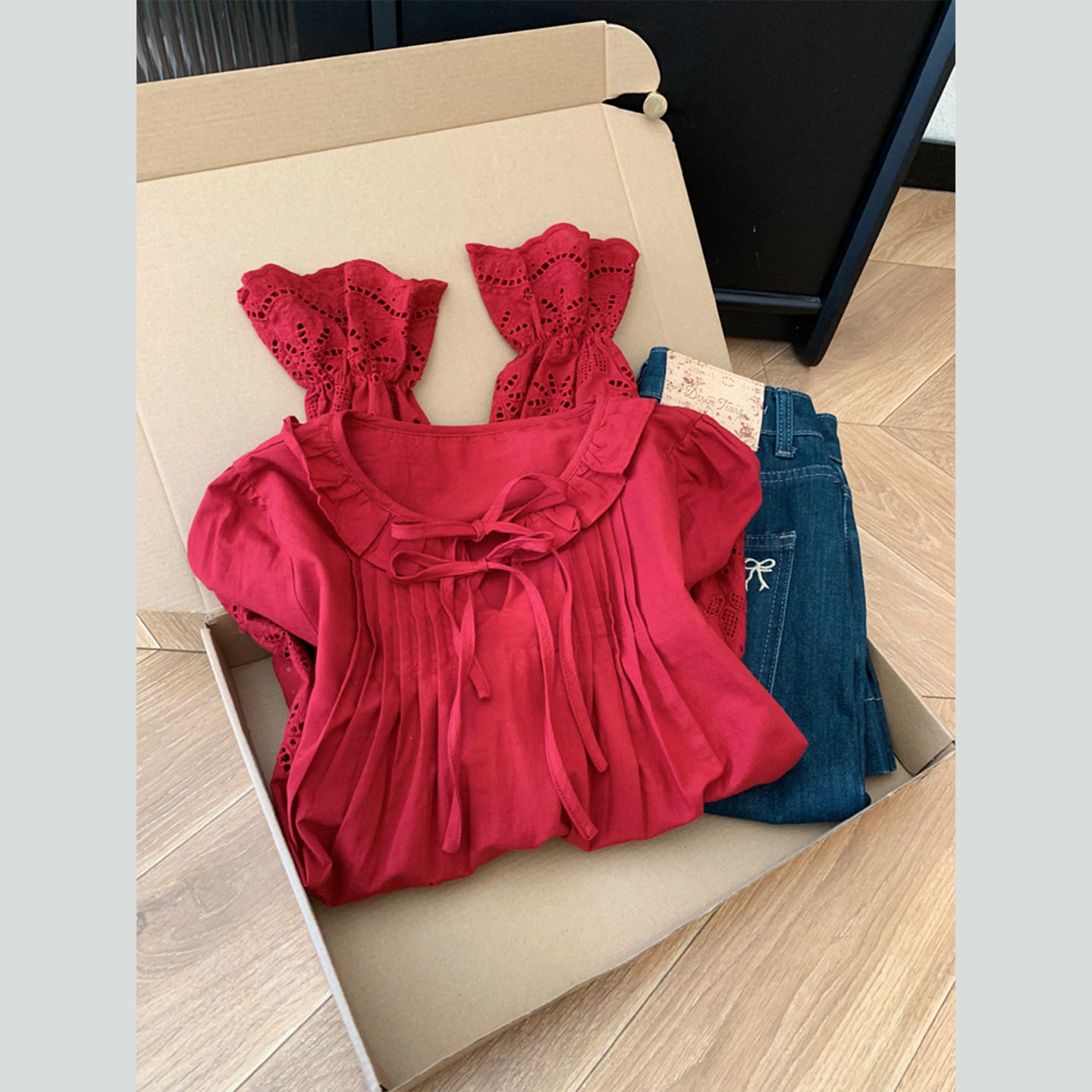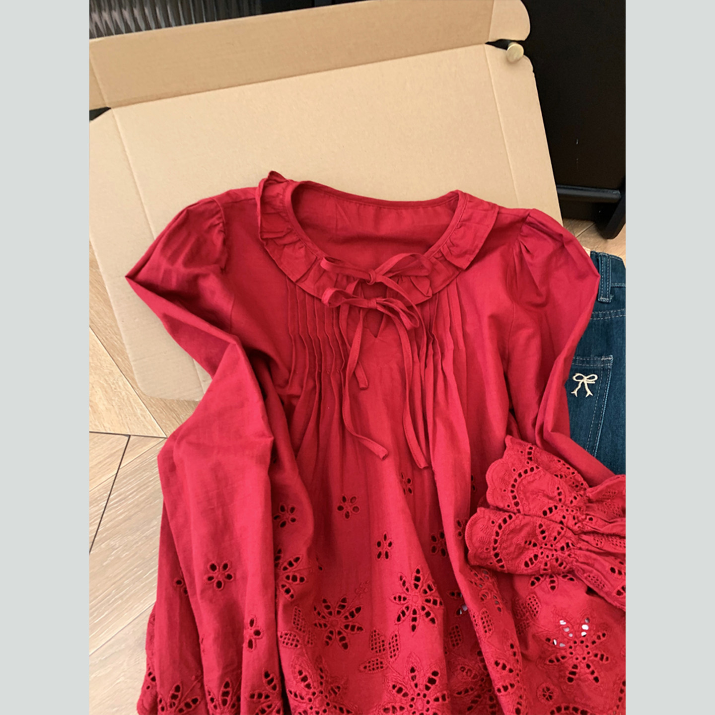 FA56237# 红色荷叶边镂空喇叭长袖衬衫女高级感轻奢减龄洋气衬衣 服裝批發女裝批發服飾貨源