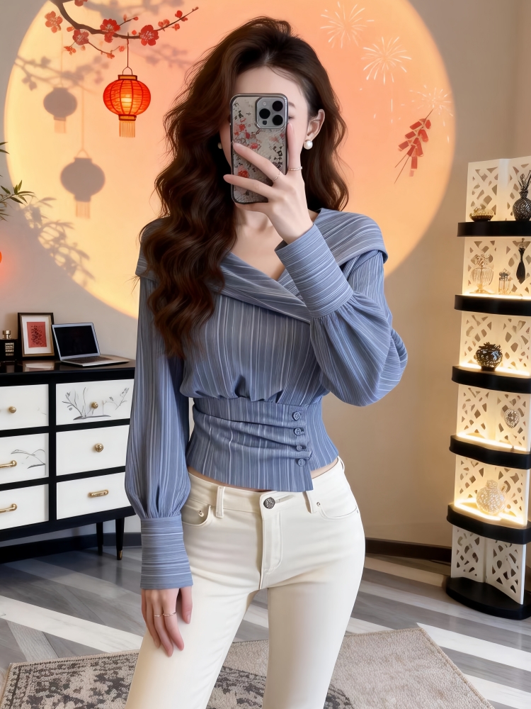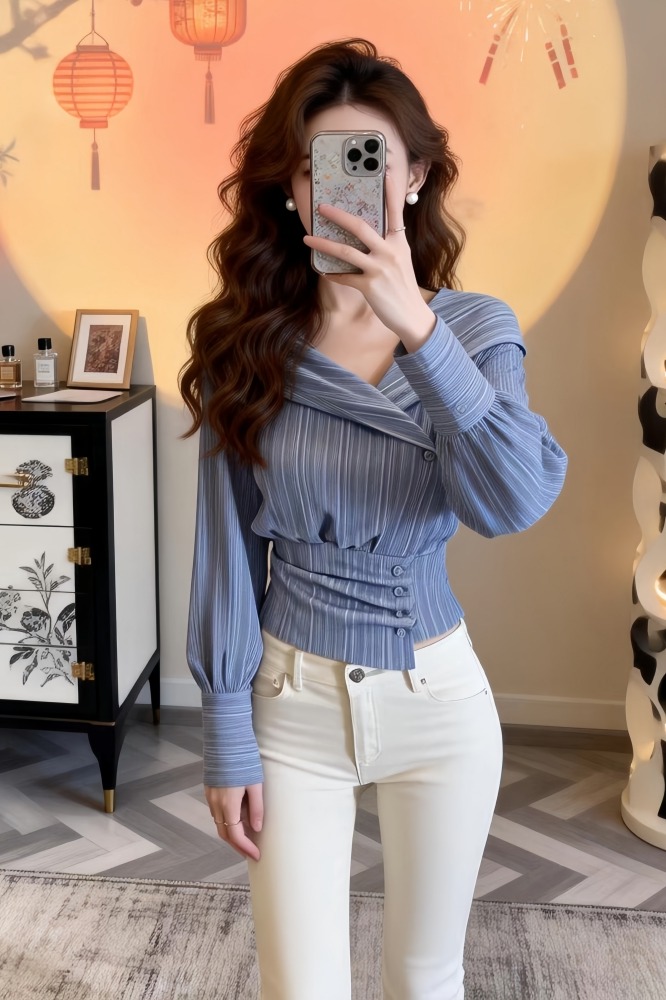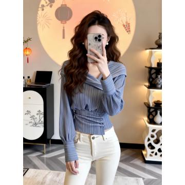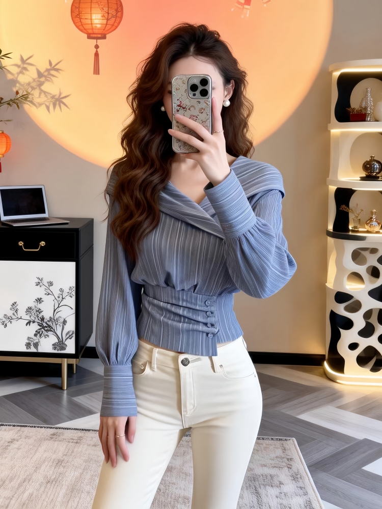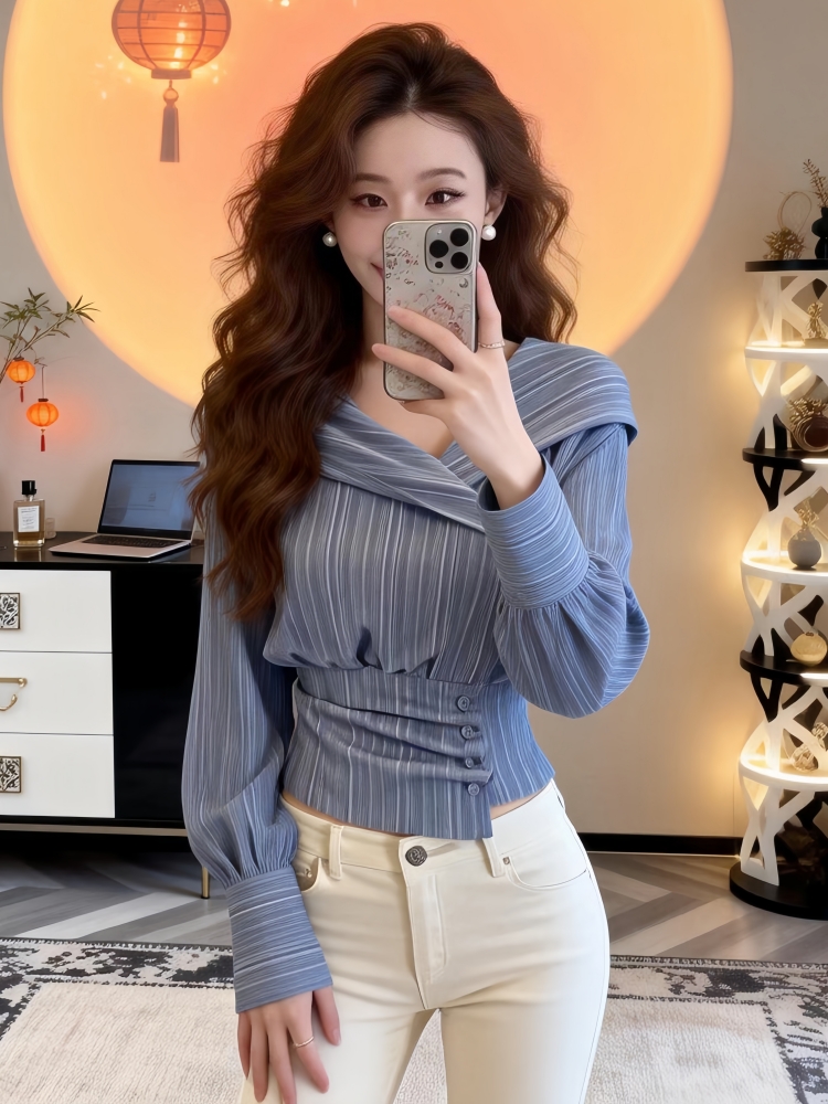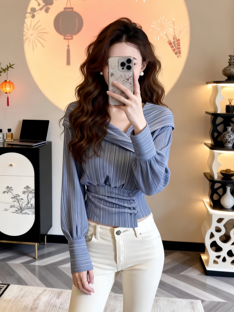 FA56239# 春季新款法式收腰修身蓝色长袖衬衫女设计感不规则锁骨绝美上衣潮 服裝批發女裝批發服飾貨源
