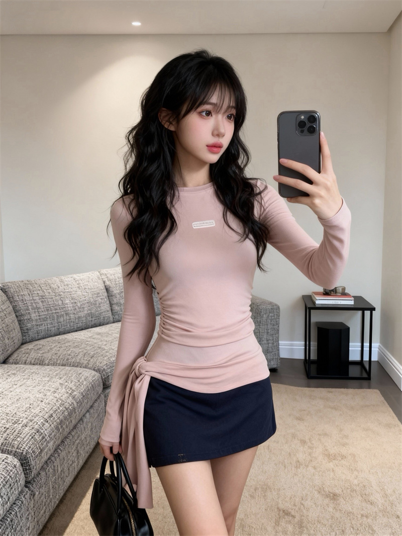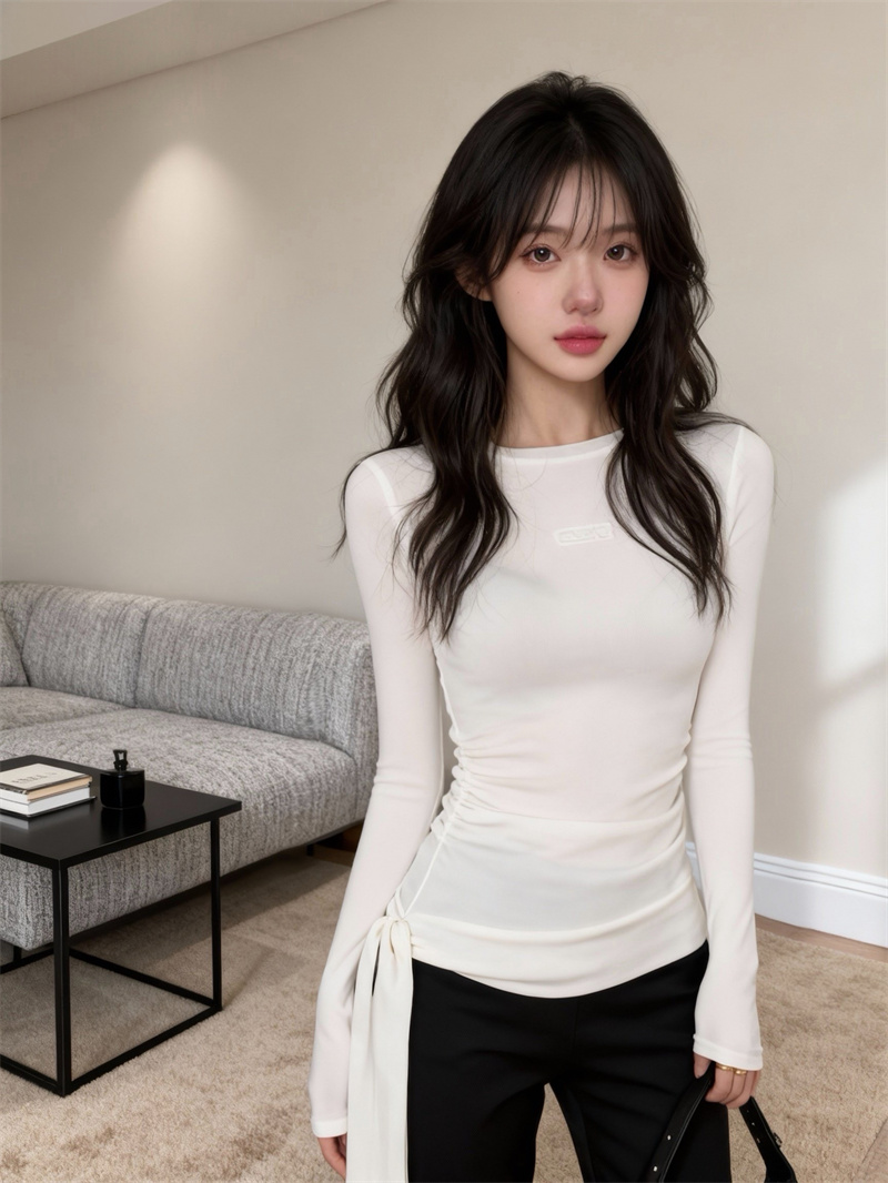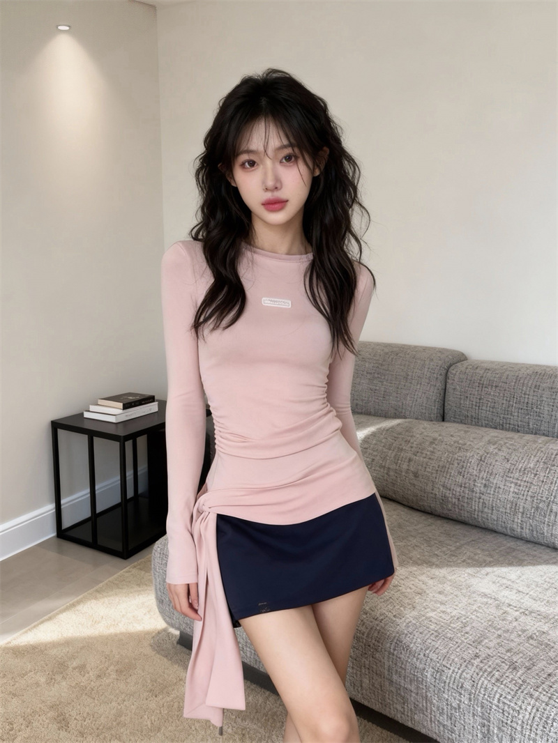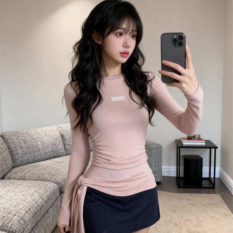 FA56240# 春上新韩系甜妹软糯长袖打底衫女刺绣抽绳绑带辣妹上衣 服裝批發女裝批發服飾貨源