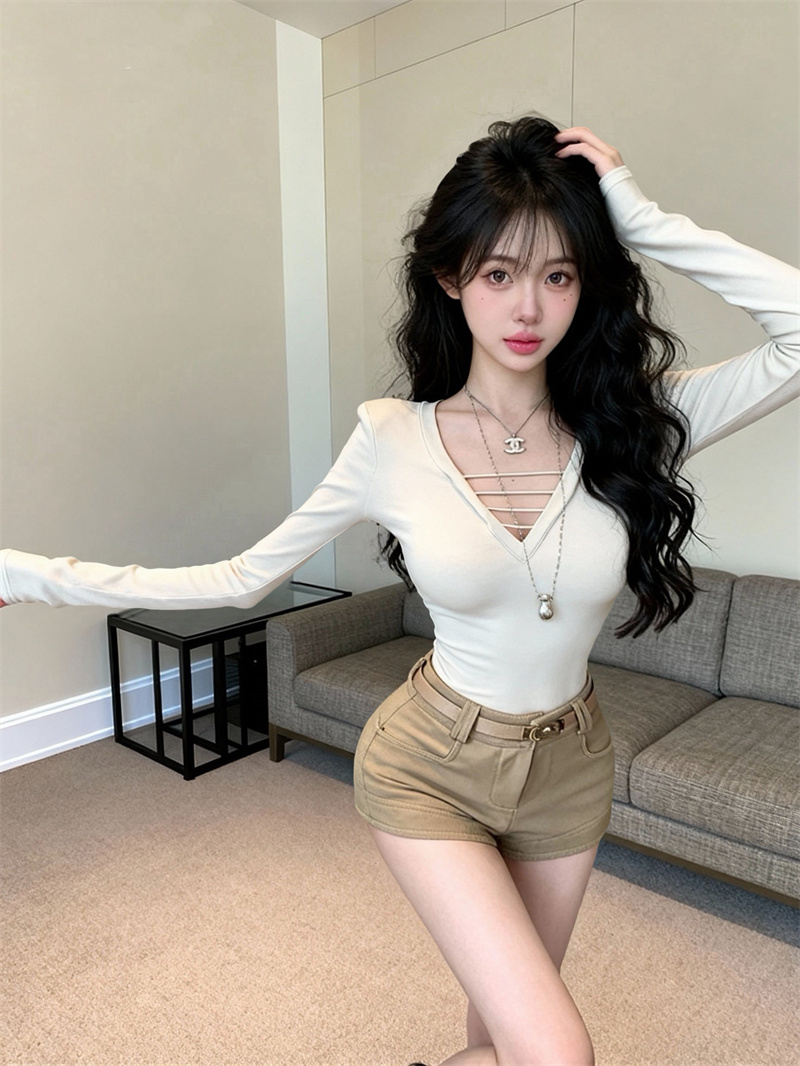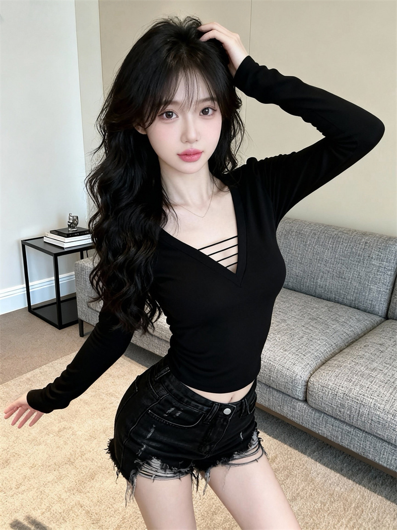 FA56242# 春上新纯欲风V领带胸垫长袖打底衫女甜辣内搭T恤上衣 服裝批發女裝批發服飾貨源