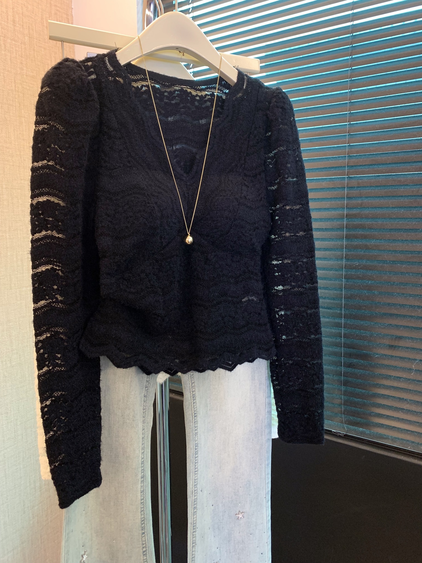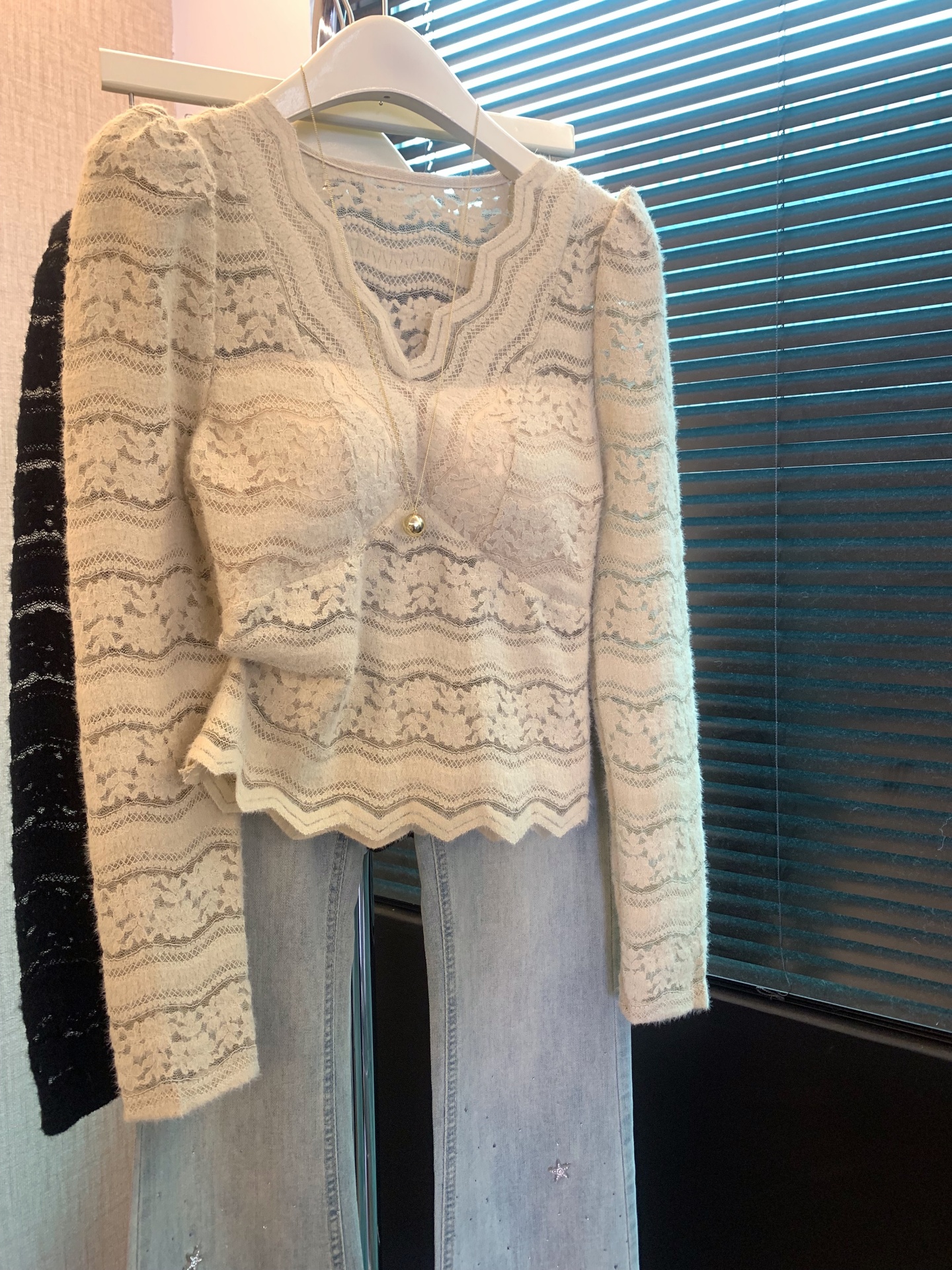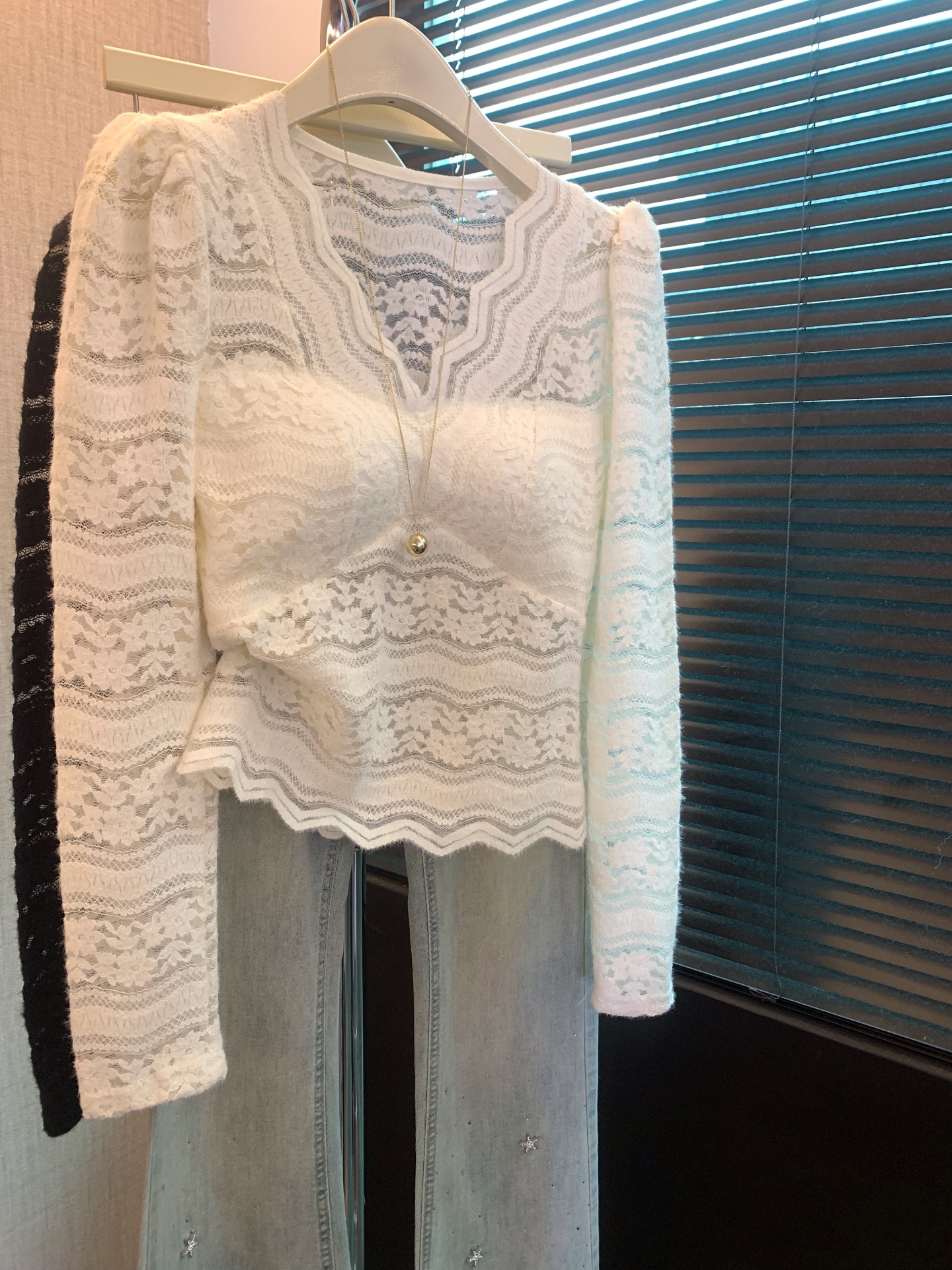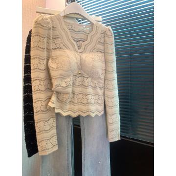 FA56257# 上法式v领蕾丝打底衫女春秋内搭镂空钩花小衫纯欲带胸垫上衣 服裝批發女裝批發服飾貨源