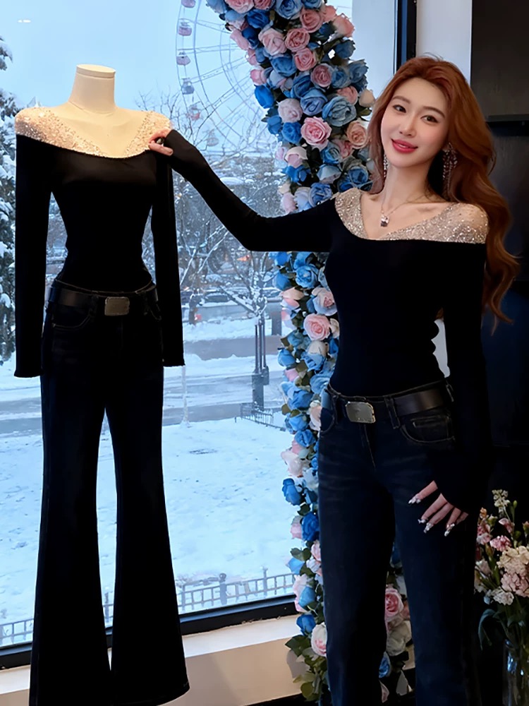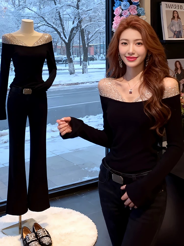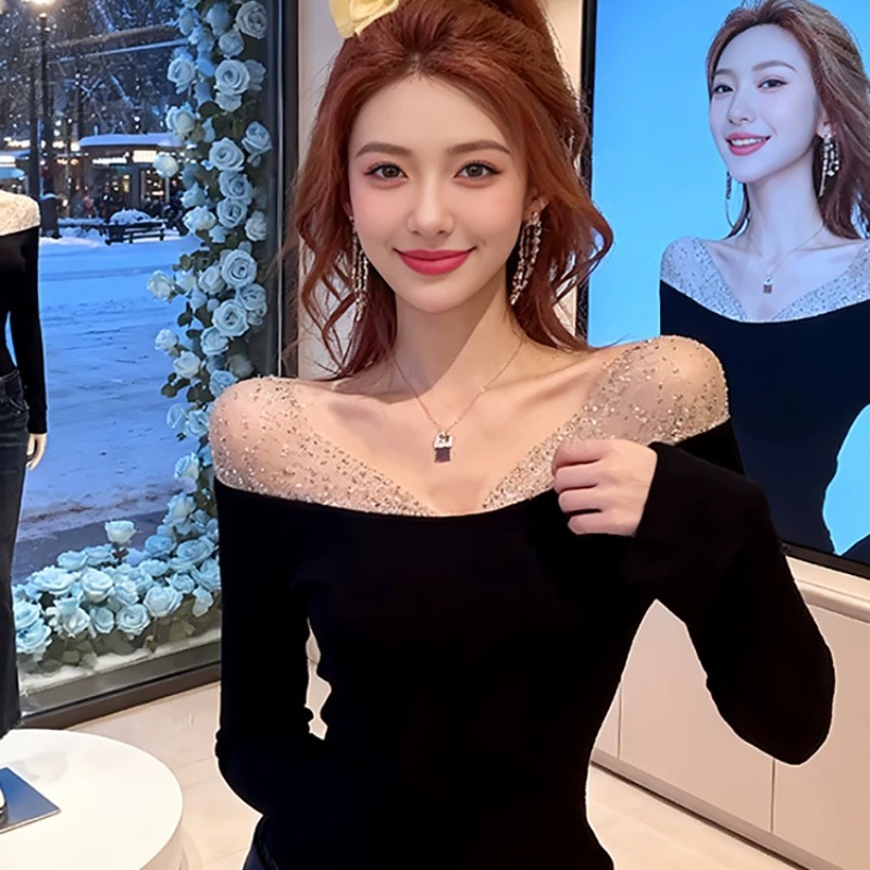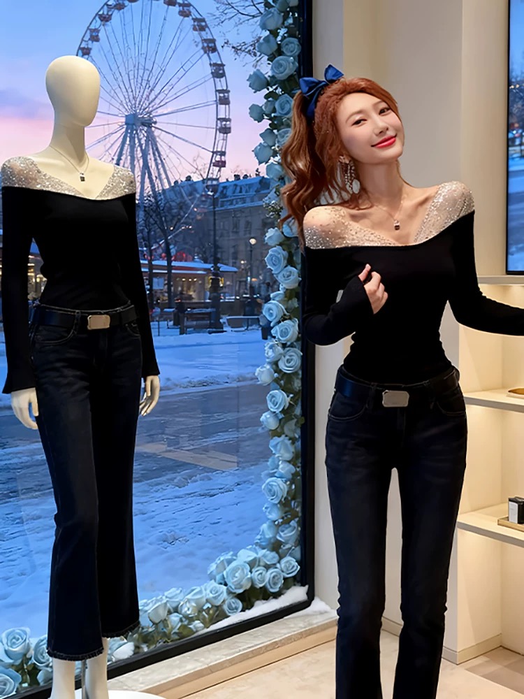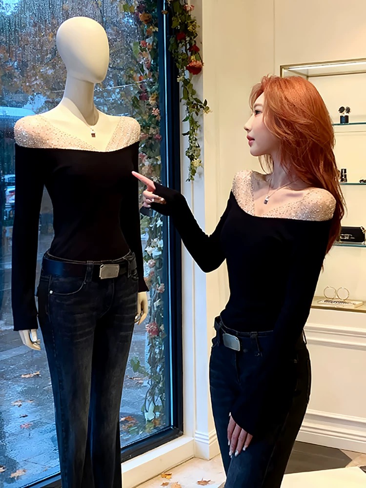 FA56279# 纯欲风气质重工烫钻露肩打底衫女秋冬黑色一字肩上衣修身显瘦T恤 服裝批發女裝批發服飾貨源